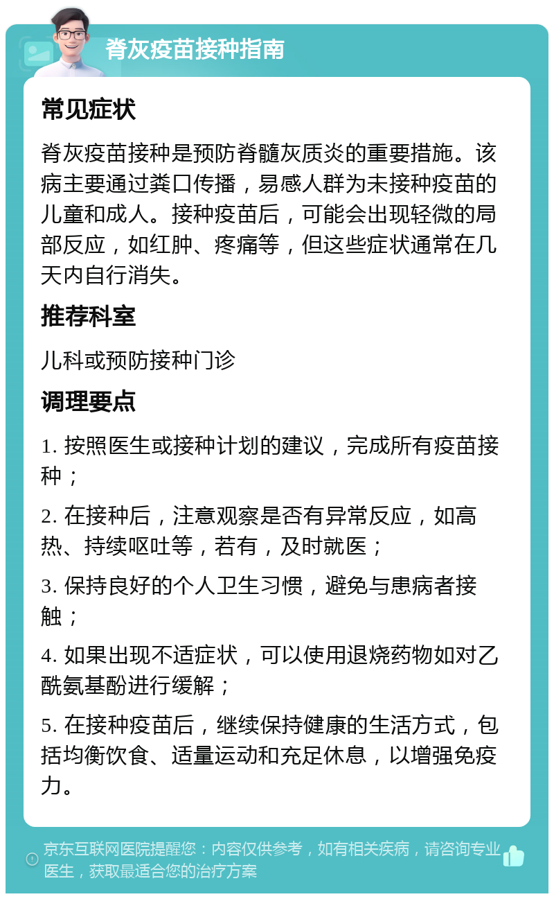 脊灰疫苗预防脊髓灰质炎脊灰疫苗全称脊髓灰质炎疫苗,主要用于预防脊髓灰质炎这是一种由脊髓灰质炎病毒引起的急性传染病,主要影响儿童的神经系统健康以下是关于脊灰疫苗预防疾病的详细解释1 脊髓灰质炎的严重性脊髓灰质炎是一种严重的公共卫生问题,主要影响儿童神经系统,可能导致永久性的瘫痪性。