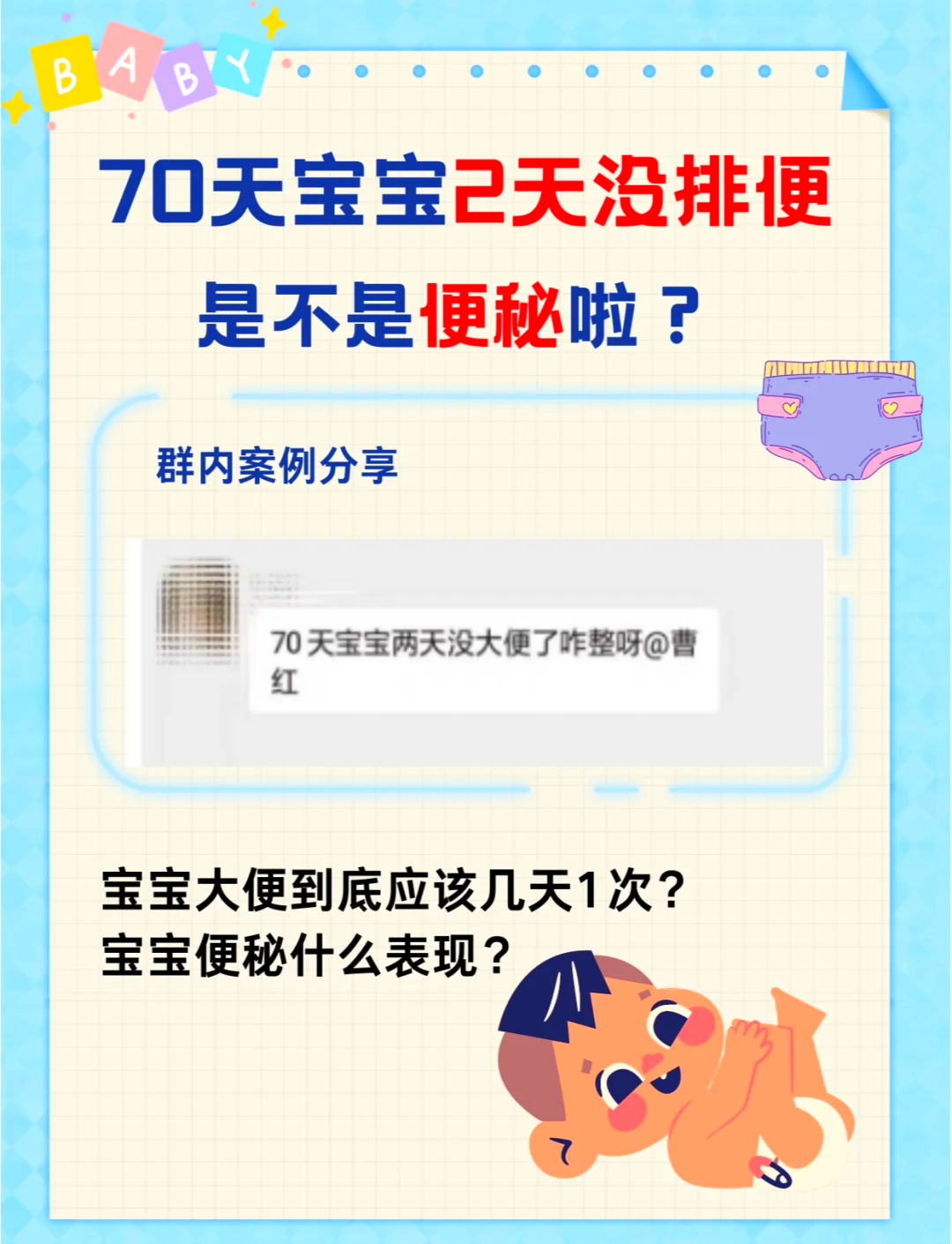 您好,宝宝便秘的话与肠道蠕动减慢,喂水少,上火等多种因素有关,平时要给宝宝多喝水,多吃蔬菜水果,增加膳食纤维,同时可以给宝宝吃点四磨汤口服液,可以帮助消化,并且可以促进肠道蠕动和排便,也可加服妈咪爱,可以调节胃肠道菌群平衡并且可以给宝宝顺时针按摩腹部,促进肠道蠕动和排便,如果还是排便困。