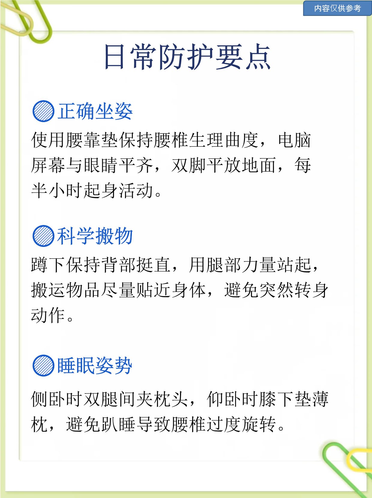 腰椎间盘突出膨出的治疗方式主要包括以下四种一一般治疗患者需以休息为主,避免长时间保持同一姿势如久坐久站,同时需纠正不良站坐姿,减少腰椎压力重体力劳动或弯腰提重物等动作应严格避免,以防加重椎间盘损伤适度进行腰部功能锻炼如“小燕飞”“五点支撑法”可增强腰背肌力量,稳定腰椎;腰椎间盘膨出的治疗方法主要包括以下四个方面一般治疗在急性发作期,患者需严格卧床休息23周,避免弯腰负重或久坐,以减轻腰椎间盘压力,缓解神经根受压导致的疼痛同时,可通过调整睡姿如侧卧时双膝间垫枕或使用硬板床维持脊柱自然曲度,促进炎症消退药物治疗针对疼痛明显的患者,可遵医嘱;一非手术治疗非手术治疗是基础,适用于多数患者,尤其初次发作或症状较轻者1卧床休息严格卧硬板床,避免坐起或站立,减轻腰椎压力初次发作病程短的患者症状可能明显缓解年轻患者恢复快,卧床时间可较短老年患者恢复慢,需延长卧床时间女性生理期需注意保暖和个人卫生2物理治疗牵引;腰椎间盘膨出的治疗方法主要分为保守治疗和手术治疗两大类,具体如下一药物治疗针对疼痛症状,可口服非甾体类抗炎药如美洛昔康塞来昔布缓解腰部疼痛若合并下肢麻木或神经根刺激症状,需联合营养神经药物如甲钴胺维生素B族促进神经修复中成药如腰痛宁胶囊也可作为辅助治疗,但需在;一卧床休息与制动卧床是基础治疗措施,通过减少腰椎负重,缓解椎间盘压力,促进膨出部位回纳建议选择硬板床,保持平卧或侧卧位,避免长时间坐立或弯腰卧床期间可适当进行腰背肌功能锻炼如“飞燕式”“五点支撑法”,但需在疼痛缓解后进行,防止加重损伤二推拿治疗需谨慎推拿可改善局部血液循环。