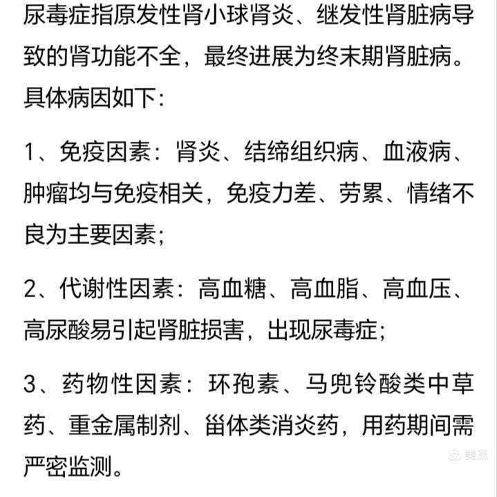 尿毒症目前无法彻底治愈尿毒症是慢性肾脏病发展到终末期的表现,此时肾脏功能严重受损,无法通过自身修复恢复但通过科学治疗和管理,可有效控制病情,提高患者生活质量并延长生存期主要治疗手段包括透析与肾移植透析治疗分为血液透析和腹膜透析两种方式通过机器或腹膜过滤血液中的代谢废物和多余水分。
