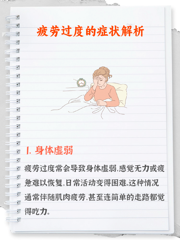 5、1 疲劳过度可能表现为多种症状,这些症状因人而异,受性别年龄等因素的影响2 在老年人中,疲劳过度可能体现为超出了正常衰老过程的过度疲劳感昏昏欲睡头昏眼花全身无力食欲减退和睡眠质量差3 此外,老年人的记忆力判断力和计算能力可能也会受到影响,整体上感觉缺乏活力4 中年人。