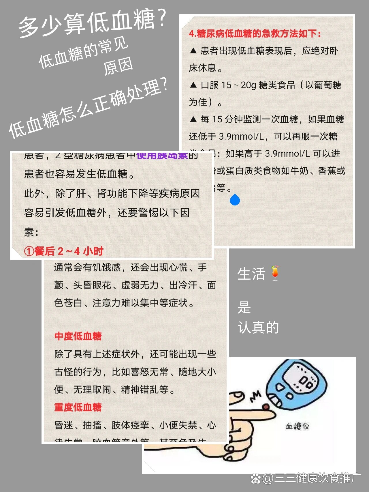 发生低血糖时,需根据症状轻重采取针对性措施,同时需了解常见诱因以预防复发具体处理及预防方法如下一低血糖的紧急处理立即补充糖分 轻度症状出汗饥饿心慌颤抖迅速摄入15克快速起效的碳水化合物,例如46块方糖或葡萄糖片 半杯约120ml果汁如橙汁苹果汁或可乐 1汤匙蜂蜜或。