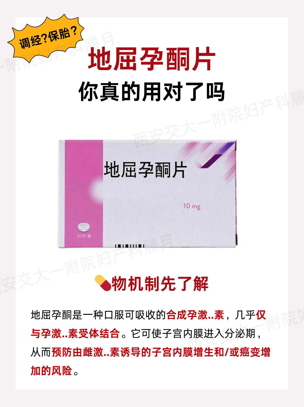 如果上升不好,也可以通过注射黄体酮的方式保胎对症治疗一般如果是孕酮低引起先兆流产情况,绝大多数通过这个药对症调理,基本能够达到保胎的作用如果剂量少,可以通过增加剂量达到保胎的作用所以达芙通地屈孕酮片保胎效果很好,一般是通过口服给药如果保胎过程中有特殊情况发生,经过保胎对症治疗以后;达芙通地屈孕酮片主要用于调节女性性激素水平,补充孕激素,从而治疗多种妇科疾病具体来说,其作用包括以下几点防止子宫内膜增生和癌变地屈孕酮能够使子宫内膜进入完全的分泌象,有效防止由雌激素引起的子宫内膜增生,进而降低癌变风险治疗内源性孕激素不足的疾病达芙通地屈孕酮片可用于治疗由内源性。