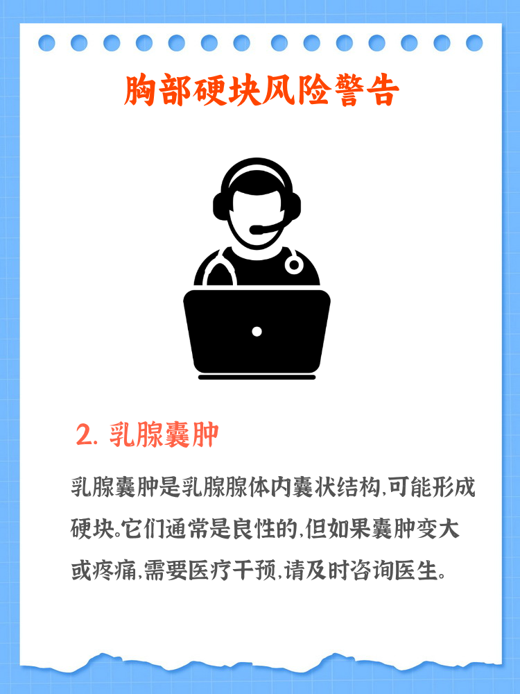 2、乳腺囊肿发展为乳腺癌的时间无法明确界定,且大多数情况下不会发展为癌症乳腺囊肿作为常见的良性乳腺疾病,多数情况下不会对健康造成严重威胁,其癌变概率较低但需注意,当囊肿内出现乳头状瘤或非典型增生等病理改变时,可能增加乳腺癌的发病风险癌变时间受多重因素影响囊肿本身的特征如类型大小;良性病变乳腺囊肿是良性的病变,由于乳腺细胞周围分泌的囊性液包裹而形成,其本质与恶性病变存在显著差异癌变罕见在临床实践中,乳腺囊肿在3个月之内转变成乳腺癌的情况是非常少见的这意味着,从乳腺囊肿直接发展为乳腺癌的概率极低并存可能性尽管乳腺囊肿本身很少癌变,但有可能与乳腺癌并存;乳腺囊肿是一种良性疾病,通常由乳腺管堵塞或乳腺小叶分泌过多引起,大多数无症状,常在体检或偶然检查中发现其癌变风险较低,但以下情况需特别关注囊肿较大若囊肿体积较大,可能引发疼痛肿胀或不适,甚至增加感染风险此时需通过医学手段评估是否需要干预囊肿反复出现或增大若囊肿在短期内反复;4乳腺不典型增生若合并乳腺不典型增生一种癌前病变,乳腺癌风险显著升高,包括乳腺囊肿癌变的可能诊断与监测方法医生通过临床检查乳腺超声或磁共振成像MRI初步诊断囊肿性质对复杂性囊肿或高风险病例,可能需细胞学或组织学检查如穿刺活检明确病理定期复查是关键,通过监测囊肿大小。