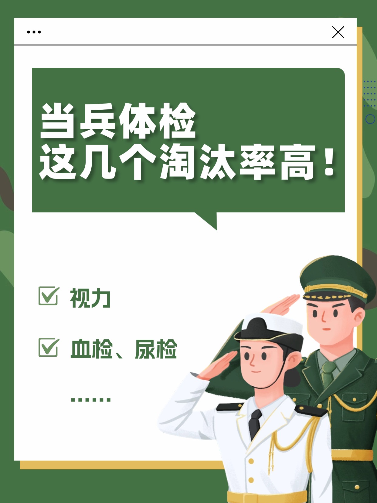 所以要想被刷下来,最简单的就是弄个小纹身 或在测视力的时候,故意让自己的视力降低或者在询问期间故意说成从别的地方入伍的,跟你报名表上的信息不符合的某些信息,也会影响入伍的呵呵,其实进军队挺好的,可以磨炼一个人的意志,做事的心态,遇事的应变能力,经过两三年的训练,培养出来的气质。