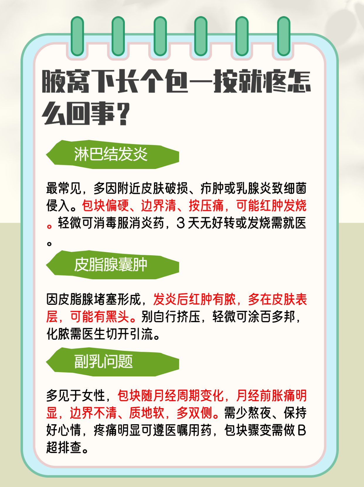 腋窝下疼痛可能是由以下原因引起的淋巴结炎症症状疼痛通常位于腋窝的深面,伴有淋巴结肿大,表面发红,按压时出现疼痛治疗主要是口服抗生素,如头孢克肟或头孢拉定,治疗周期约为710天,疼痛可缓解,肿大的淋巴结可消退副乳引起的疼痛位置疼痛通常位于腋窝偏下,乳腺外上方一点症状副乳;女性腋下疼痛不一定是癌症女性腋窝下异常疼痛可能与多种情况有关神经炎或疱疹病毒感染这是导致腋下疼痛的常见原因之一如果是带状疱疹,主要是皮肤病毒感染,抗病毒治疗可以有明显的效果肿瘤虽然癌症也可能导致腋下疼痛,特别是腋窝淋巴结转移瘤,但这种情况需要通过医学检查来确诊在诊断癌症时。