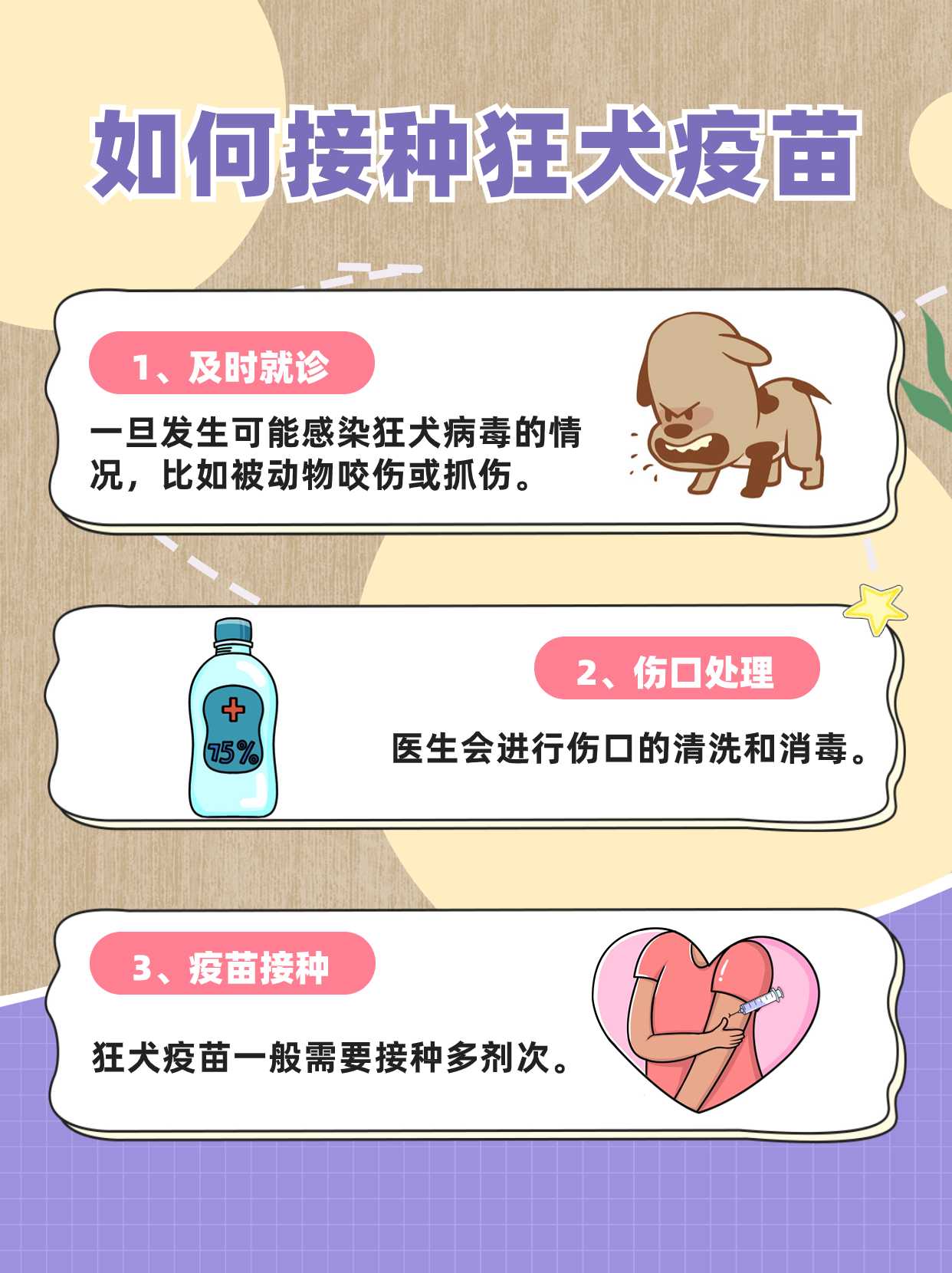 二禁忌1一般禁忌对疫苗成分包括辅料或硫酸庆大霉素过敏者禁止接种患急性疾病严重慢性疾病或发热者,建议病情稳定后接种,以免加重免疫负担或影响疫苗效果2特殊情况孕妇研究证实狂犬疫苗对孕妇和胎儿安全,被咬伤后应按规范接种儿童接种程序与成人相同,家长需密切观察反应免疫功能;6 严格完成全程接种狂犬病疫苗需按5针法0371428天或4针法211程序完成全程接种漏种或延迟接种可能降低抗体水平,导致免疫失败若因特殊原因中断,需尽快联系医生补种总结接种狂犬病疫苗后,需从观察反应休息饮食伤口护理行为禁忌及接种程序六方面综合管理,以确保;接种狂犬疫苗后,需注意以下事项及禁忌一观察身体状况接种后应在接种单位观察区域留观30分钟,确认无不适症状如过敏反应呼吸困难等后再离开若出现严重不适,需立即就医二避免剧烈运动与劳累接种后7天内避免剧烈运动重体力劳动或长时间熬夜,保证充足睡眠和休息,以减少免疫系统负担三。