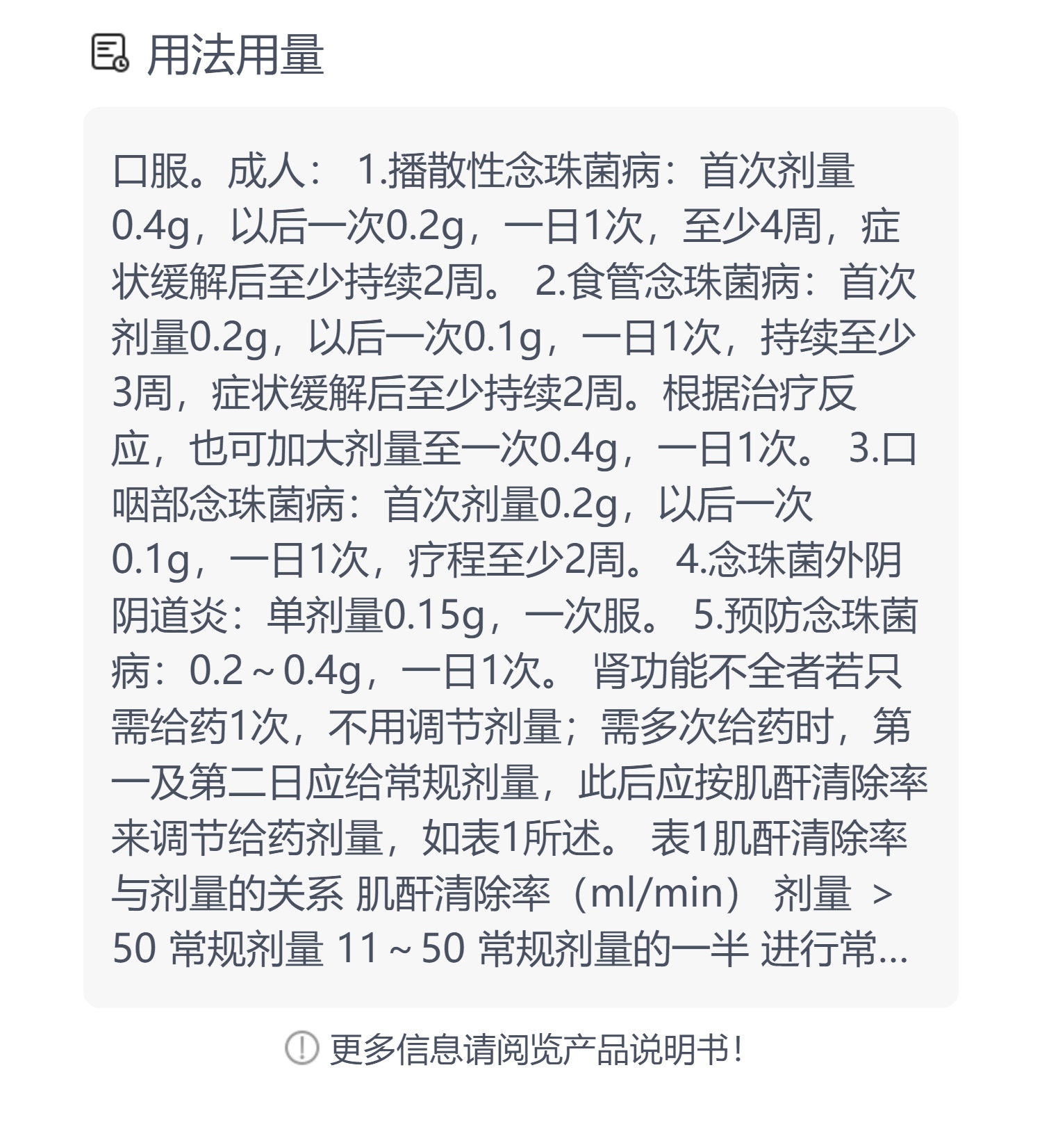 常用剂量为第一日04g8片,以后每日02~04g4片 8片,隐球菌性脑膜炎治疗期一般为脑脊液菌检转阴后,再持续6~8周为防止艾滋病患者隐球菌脑膜炎复发,完成基本治疗后可继续给予氟康唑维持治疗,日剂量02g4片,持续10~12周粘膜念珠菌病包括口咽部食道非侵入性支气管。