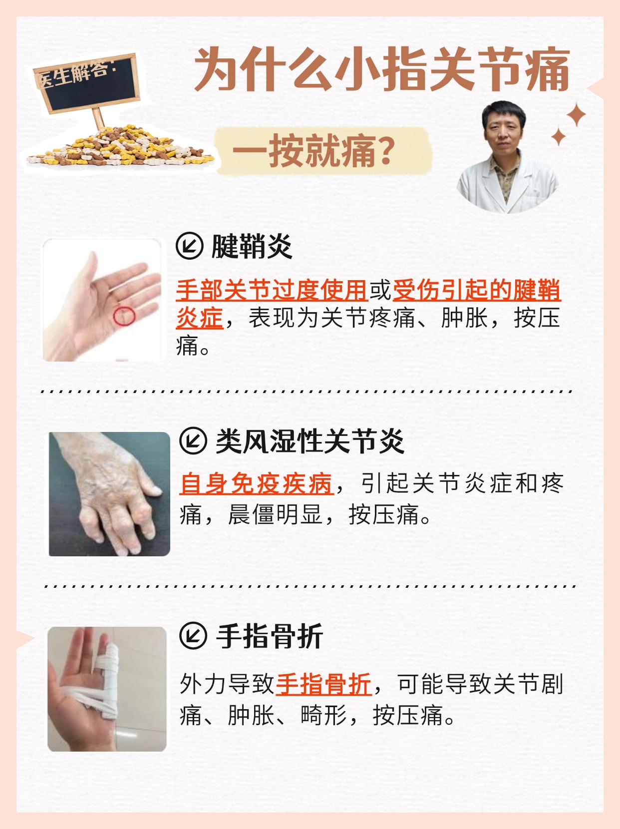 1 关节炎骨关节炎和类风湿关节炎是常见类型骨关节炎多与年龄相关,表现为关节疼痛肿胀及晨起僵硬,活动后可能缓解类风湿关节炎是自身免疫病,常累及双手小关节,伴对称性肿胀畸形,需通过血液检查如类风湿因子确诊2 感染甲沟炎脓性指头炎等细菌感染可引发局部红肿剧痛,甚至发热若。