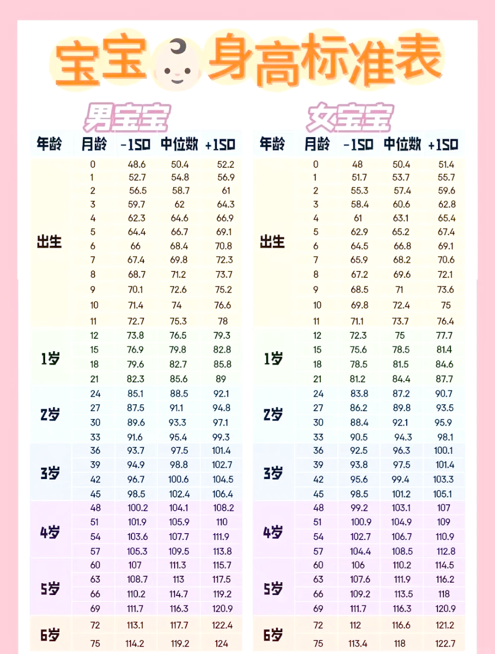 6、这个月可以开始给宝宝添加辅食了,辅食的意义不仅在于满足营养需要,它还是宝宝学习进食,逐渐适应母乳以外的食物的过程#xF466男孩成长指标身高cm579717平均646,体重kg5251039平均745,头围cm380459平均417#xF467女孩成长指标身高cm567700平均631,体重kg493966平均683,头围cm372446。
