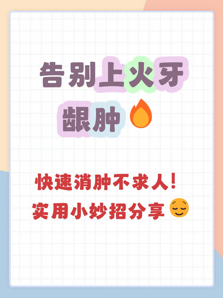 治疗上火牙龈肿痛的小妙招可从以下四个方面入手一保持口腔清洁正确刷牙是基础选择软毛牙刷,每日早晚用巴氏刷牙法刷牙,每次不少于3分钟,可清除食物残渣和细菌,降低牙龈炎症风险规范刷牙可降低炎症概率30%50%儿童需家长辅助选择专用牙膏,老年人应避免刷毛过硬损伤牙龈使用漱口水辅助含氯。