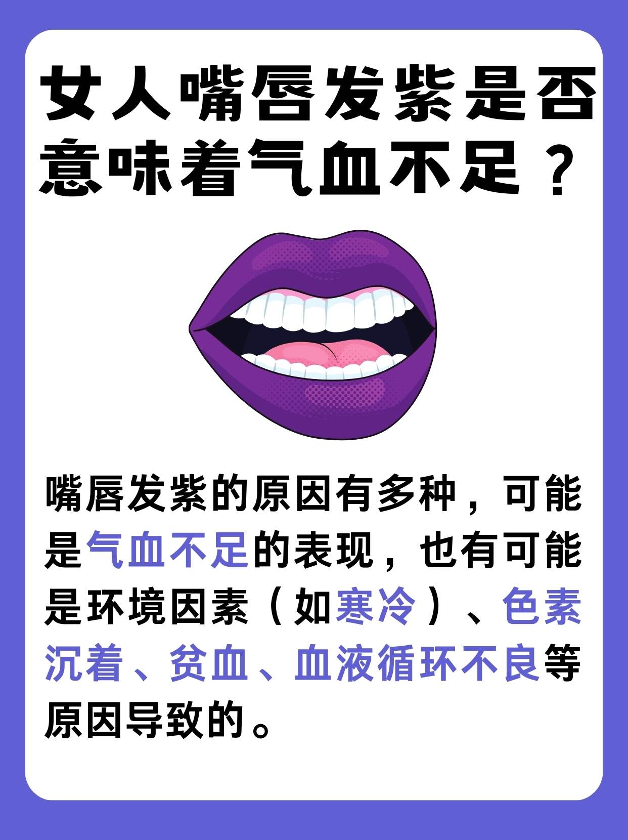 2、1 贫血女性因生理期失血较多,若未及时补充营养如铁维生素B12等,易导致贫血缺铁性贫血是最常见类型,表现为血红蛋白减少,携氧能力下降,进而引发嘴唇甲床等黏膜部位发紫需通过血常规检查确诊,治疗以补铁调整饮食或药物干预为主2 肺部疾病肺部功能异常导致缺氧时,嘴唇可能发紫常见疾;女人嘴唇发紫是身体哪里不好 1缺乏维生素C会导致嘴唇发黑或紫黑色斑点,以及皮肤上的瘀点和瘀斑此外,当缺乏维生素C时,患者还容易出现不适抑郁食欲不振营养不良面色苍白牙龈肿痛出血等,而儿童则可能出现假性麻痹肿胀下肢压痛等症状骨膜下出血显然等待2嘴唇的皮肤很薄,下面有。