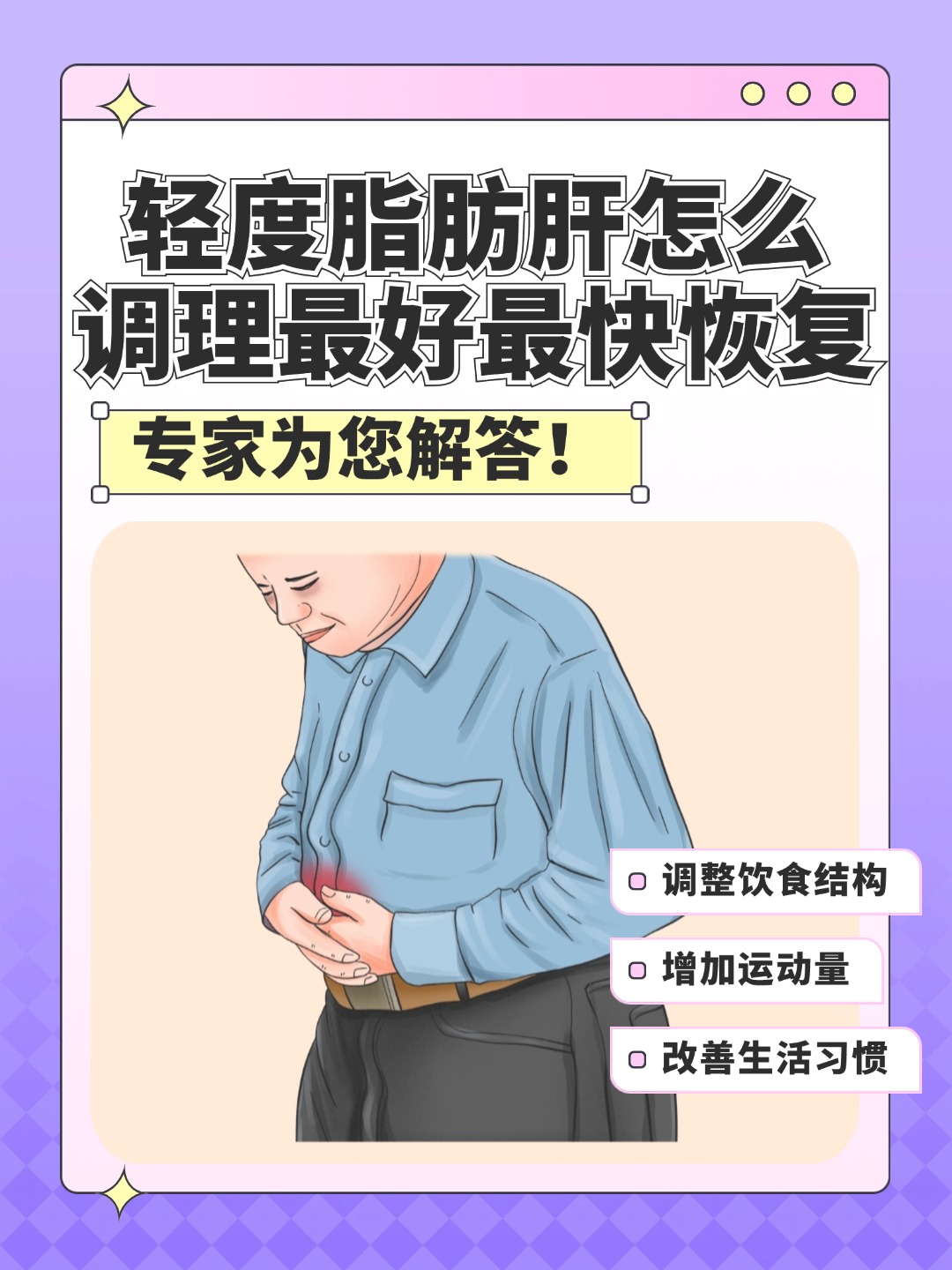 5、2 核心成因导致中度脂肪肝的因素包括生活方式长期过量饮酒高脂高糖饮食缺乏运动引发的营养过剩营养缺乏蛋白质胆碱维生素等必需营养素摄入不足疾病关联肥胖症糖尿病高血脂症甲状腺功能减退症等代谢性疾病3 典型症状患者可能出现非特异性表现,如疲倦乏力食欲减退恶心呕吐;中度脂肪肝的症状表现主要包括以下几点非特异性症状乏力患者可能会感到全身无力,容易疲劳恶油对油腻食物产生厌恶感,食欲不振恶心常伴有胃部不适,有呕吐的冲动尿黄尿液颜色偏黄,可能是肝脏功能受损的表现腹胀腹部感觉胀满,有时伴有轻微疼痛特异性症状肝区肿痛不适这是中度。