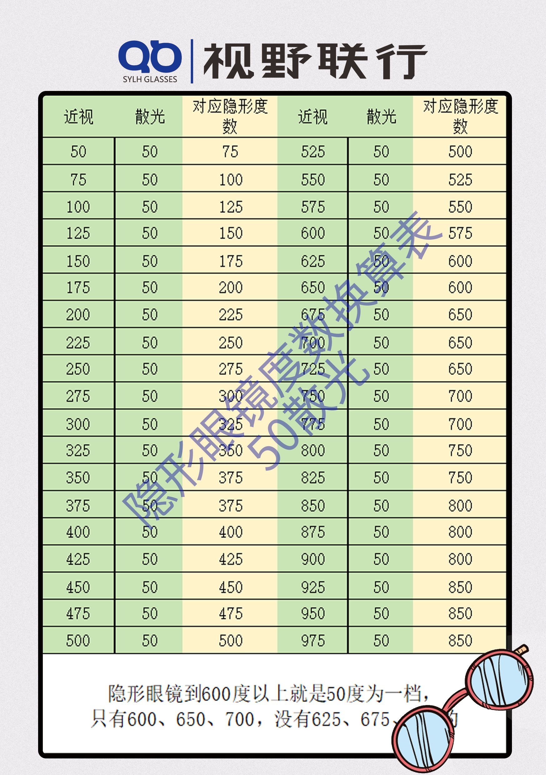 8、框架眼镜度数在775度1125度之间换算公式或表格参考如下同样以图片形式展示例如,框架眼镜度数为800度时,对应的隐形眼镜度数为750度或725度根据具体品牌和产品可能有所不同框架眼镜度数为1000度时,对应的隐形眼镜度数为950度或925度散光度数换算方法对于含有散光的眼镜度数,换算为隐形。