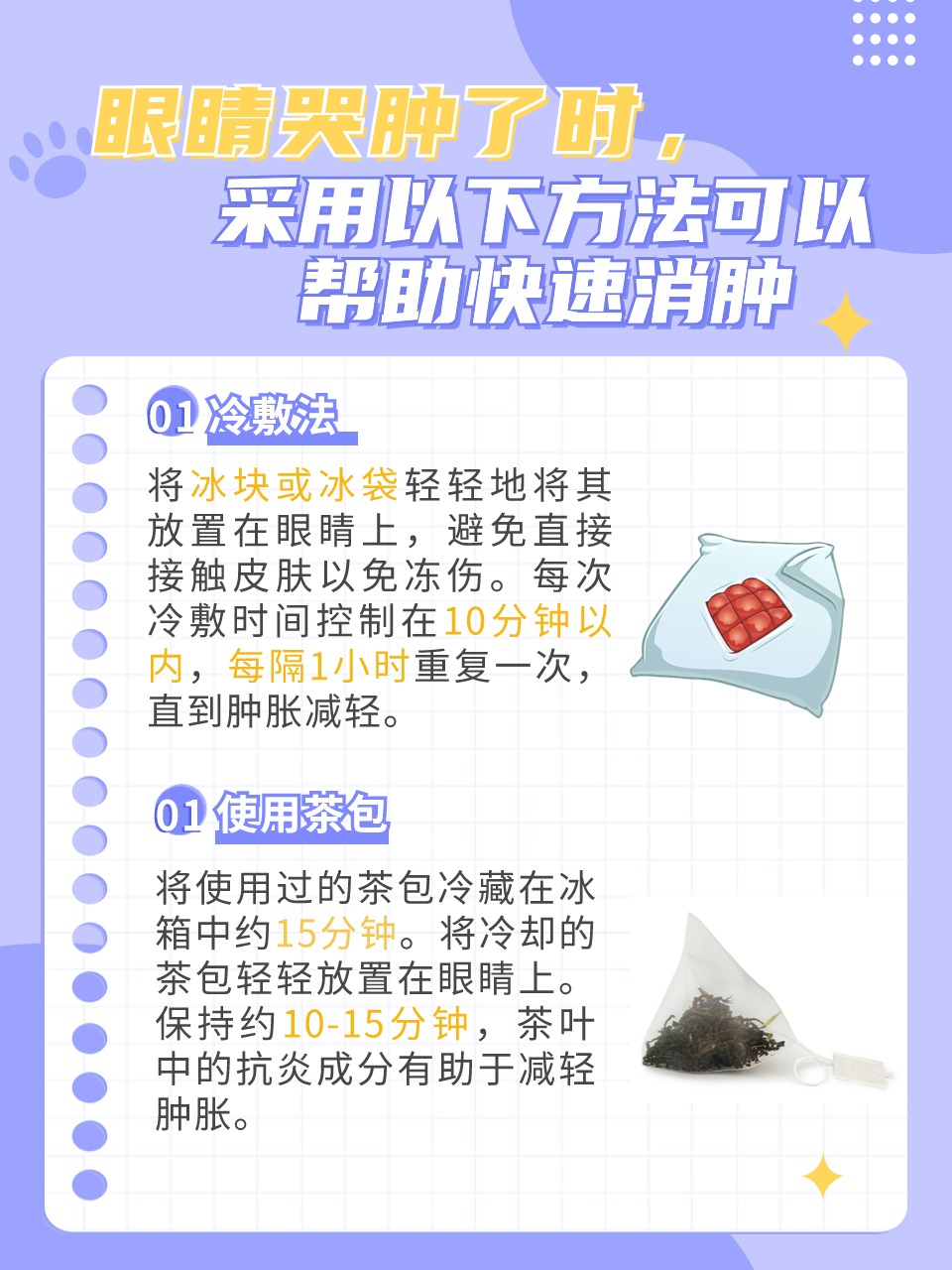13、眼睛快速消肿的办法如下冷敷若眼睛因外伤或急性炎症导致肿胀,24小时内可用冰袋或冷毛巾冷敷,每次1520分钟,每日34次冷敷通过收缩血管减少出血和渗出,从而缓解肿胀需注意避免冰块直接接触皮肤,可用毛巾包裹热敷24小时后,若肿胀未消退,可改用热毛巾或热水袋热敷,每次1520分钟,每日34。