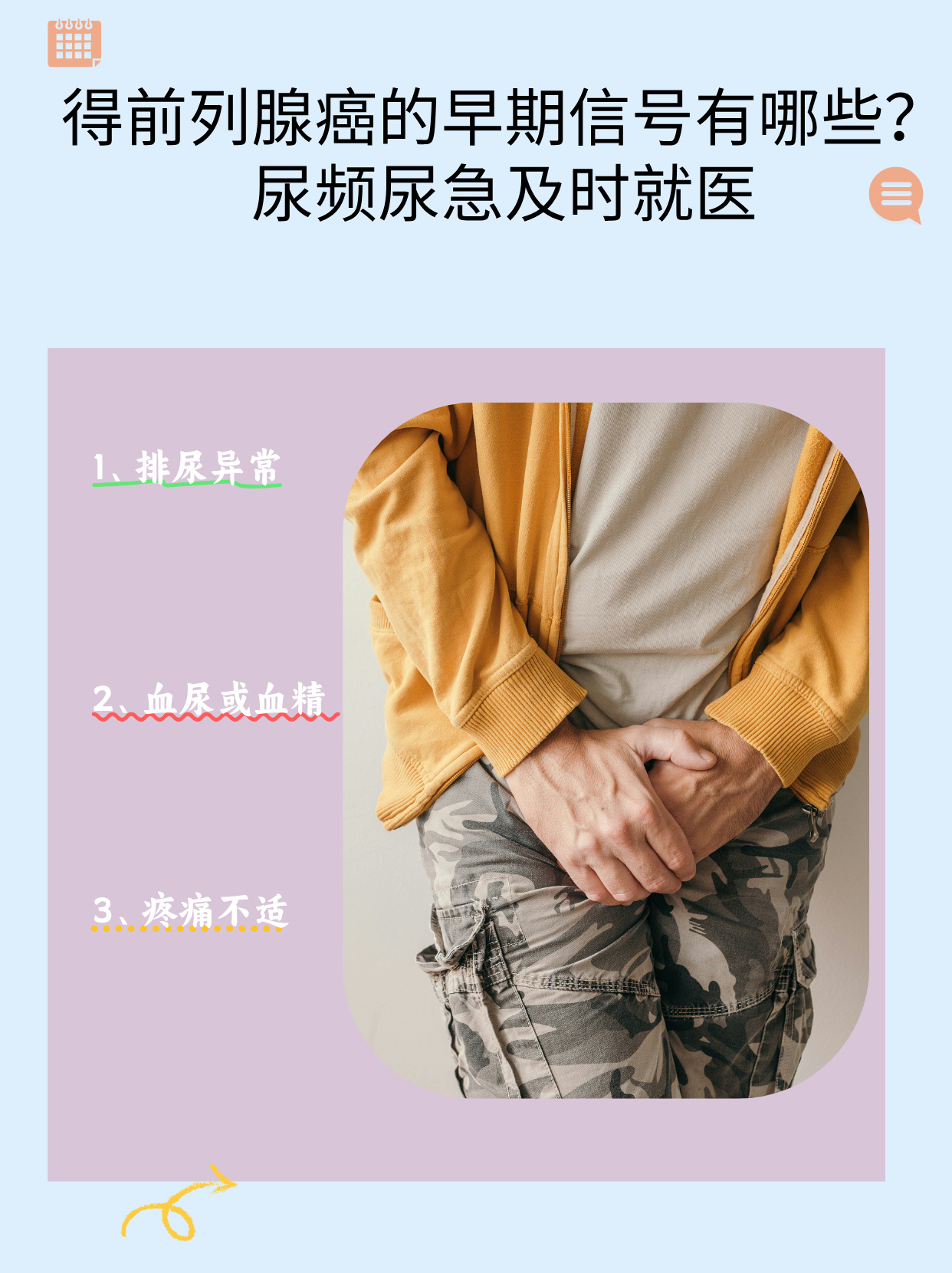 11、前列腺癌早期症状不典型且易被忽视,常见表现如下1 排尿相关症状前列腺癌早期可能因肿瘤刺激或压迫尿道,导致尿频尿急尿痛,以及排尿困难如尿流变细无力或中断这些症状与良性前列腺增生相似,需通过医学检查区分2 血尿肿瘤侵犯尿道或膀胱时,可能引发血尿,表现为肉眼可见的尿液带血或镜下。