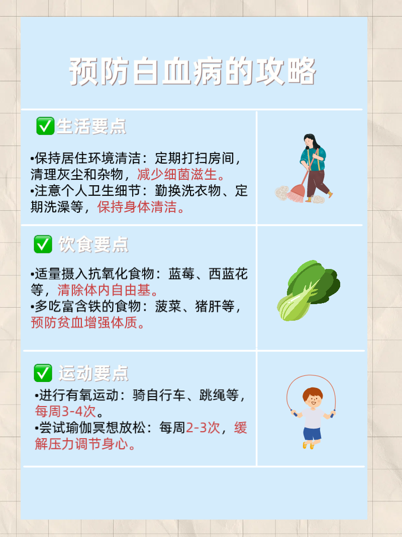 12、急性白血病的发病原因主要包括以下几个方面1遗传因素某些基因突变或染色体异常会显著增加患急性白血病的风险例如,家族中有白血病患者时,其后代发病概率可能高于普通人群此外,先天性遗传综合征如唐氏综合征患者因染色体异常,也更容易罹患此病2电离辐射长期或大量接触电离辐射如X射线γ射线。
