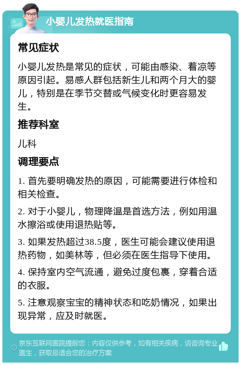 11、特殊人群提示对于新生儿出生28天以内出现病毒性感冒发烧的情况,应立即就医,因为新生儿免疫系统极其脆弱,病情变化可能较快,不能等待观察而对于有基础疾病的宝宝出现病毒性感冒发烧,除了按照上述一般护理要点进行护理外,更要密切关注宝宝的病情变化,并及时与医生沟通宝宝的基础疾病情况。
