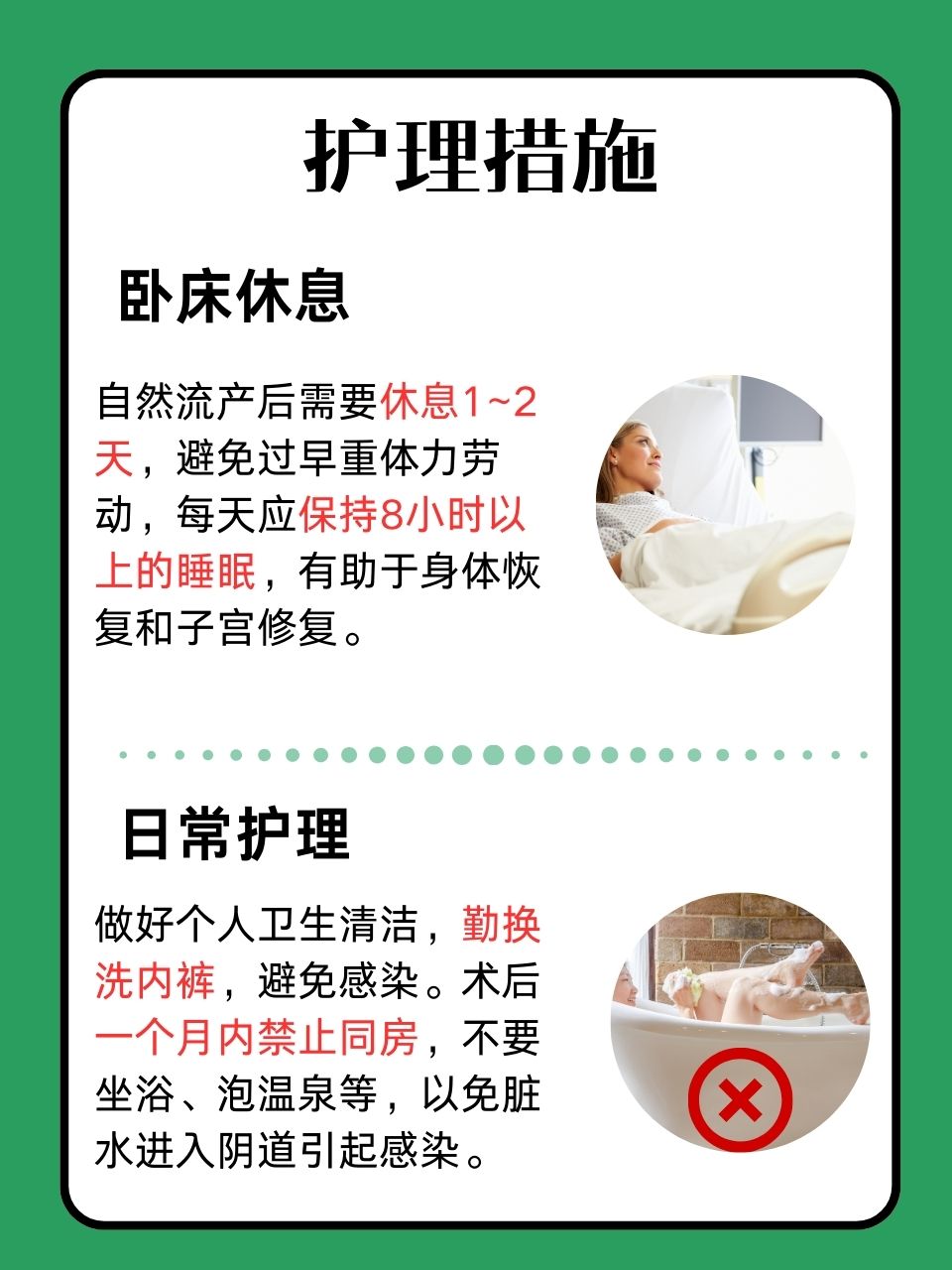 一休息与活动 充分休息自然流产后身体虚弱,子宫内膜等组织受损,一般建议休息12周期间避免长时间站立行走或重体力劳动,防止过度劳累影响恢复年龄较小女性身体机能恢复较快,但仍需保证足够休息年龄较大女性恢复能力较弱,更需充足休息以促进身体复原同时,要避免熬夜,保证每天78小时以上。