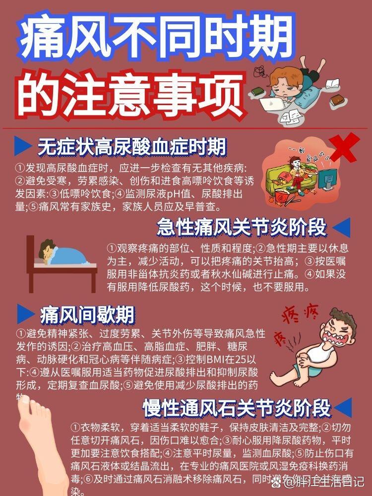 9、BMIlt24,避免肥胖诱发代谢紊乱定期监测血尿酸水平目标值lt360μmolL,有痛风石者lt300μmolL,必要时在医生指导下使用降尿酸药物如别嘌醇非布司他或抗炎镇痛药如秋水仙碱非甾体抗炎药治疗关键在于长期坚持健康生活方式,结合医学干预,才能有效控制病情并提高生活质量。