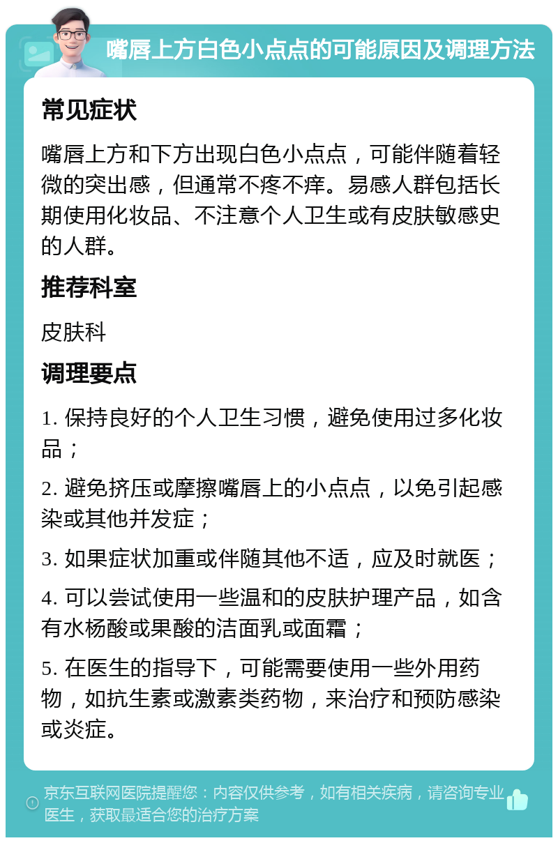 嘴唇上有白色的小点点有可能是脂肪粒,平时应该要合理地调整饮食结构,可以有效的缓解症状,尽量少吃油炸类的食物,多吃新鲜的蔬菜和水果,改掉不健康的饮食习惯,如果,病情比较严重的话,可以配合药物治疗,也可以采取物理疗法来改善症状,物理疗法适合病情较轻的患者。