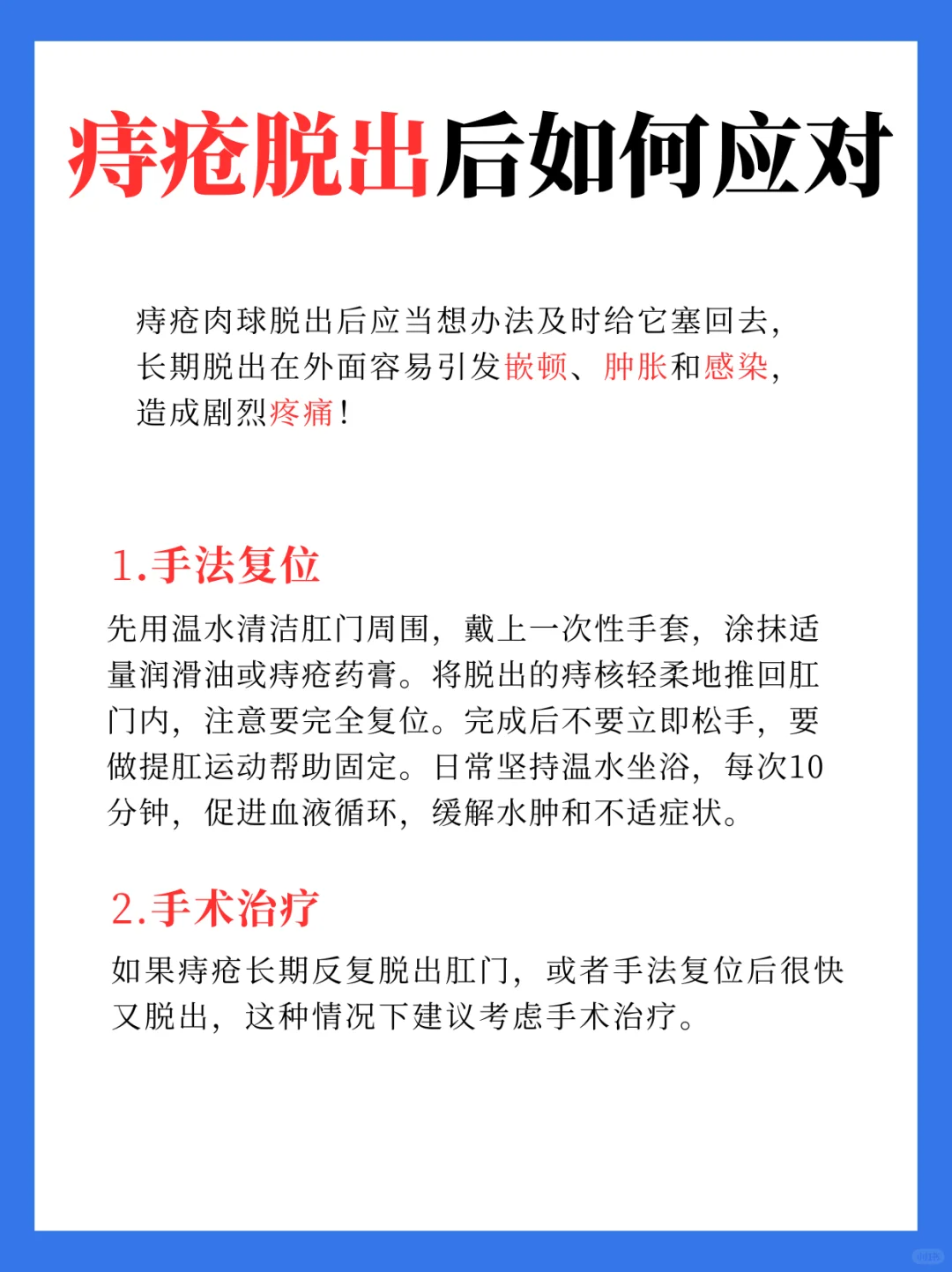 坐浴温水或高锰酸钾溶液坐浴,促进血液循环,缓解痉挛疼痛和肿胀药物治疗使用痔疮膏栓剂消肿止痛止血直肠脱垂患者可选用促进黏膜修复的药物手术治疗若保守效果不佳或病情严重如内痔脱出无法回纳直肠脱垂影响生活质量,需手术干预常见术式包括吻合器痔上黏膜环切术PPH治疗严重内痔。