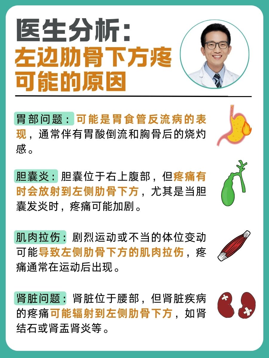 2、左胸肋骨下方隐隐作痛可能由以下原因引起,需根据症状特点及时处理1 肋软骨炎肋软骨炎是胸骨与肋骨交界处软骨的炎症,表现为局部压痛,深呼吸咳嗽或运动时疼痛加重病因可能与感染创伤或自身免疫反应有关多数情况下可自行缓解,疼痛期间可通过热敷非甾体抗炎药如布洛芬缓解症状若疼痛持续超过2周伴随发热或呼吸困难;左肋骨下方里面隐隐疼痛可能与以下原因有关1肋软骨炎或肋间神经痛肋软骨炎是肋软骨与胸骨连接处的非化脓性炎症,肋间神经痛则因肋间神经受压或炎症刺激引发两者常由劳损如长期保持不良姿势受凉或过度运动诱发,表现为局部隐痛压痛,活动或咳嗽时可能加重2局部肿瘤或感染性病变左肋骨下方;左前肋骨下方隐隐疼痛可能由多种原因引起1肋软骨炎与感染创伤或自身免疫反应相关,表现为左前肋骨下方压痛及肿胀,活动或按压时疼痛加剧2胸膜炎胸膜受感染或自身免疫性疾病影响,深呼吸咳嗽时疼痛加重,可能伴随发热或呼吸困难3胃部疾病胃溃疡胃炎等消化系统疾病可引发左前肋骨下方;左肋骨下面隐隐作痛可能由以下原因引起1胃部疾病胃溃疡胃炎胃食管反流病等胃部疾病可能导致左肋骨下方疼痛疼痛特点进食后加重,可能伴随恶心呕吐腹胀等症状2胰腺疾病胰腺炎胰腺癌等胰腺疾病可能引发左肋骨下方疼痛疼痛特点通常较为剧烈,进食后加重,可能伴有恶心呕吐发热等症状;左侧肋骨下方隐隐疼可能由以下原因引起,需结合具体症状和医学检查综合判断1 胃部疾病胃溃疡胃炎等胃部疾病可能导致左侧肋骨下方疼痛,疼痛特点与进食相关,如进食后加重或出现饱胀感,可能伴随反酸嗳气等症状长期饮食不规律或幽门螺杆菌感染者需重点排查2 胰腺疾病胰腺炎或胰腺癌可能引发左侧肋骨。
