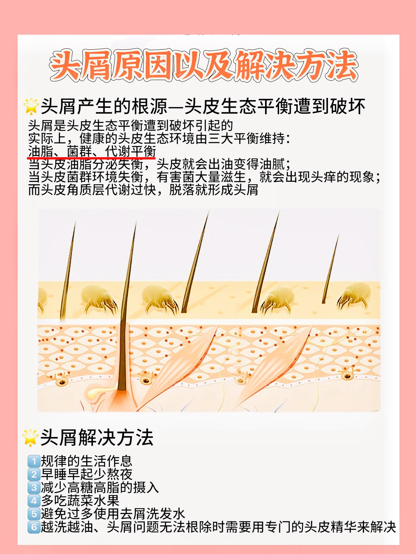2、头皮屑的产生主要与以下因素有关1头皮细胞过度增生头皮的角质细胞会持续生长和脱落,形成自然的新陈代谢过程若这一过程出现异常,导致角质细胞过度增生或脱落周期缩短,便会形成肉眼可见的头皮屑2头皮炎症头皮炎症如银屑病脂溢性皮炎会刺激细胞异常增殖,同时引发角质层增厚这种病理变化会加速表皮细胞脱落,形成片状或粉;头屑的形成主要是由于头皮的自然代谢过程中废旧角质的堆积,当这种代谢出现紊乱时,就会导致头屑过多以下是头屑形成的具体原因及机制一自然代谢产生废旧角质 头皮作为人体的一部分,也在不断进行新陈代谢代谢过程中,废旧的角质层会脱落,这是正常的生理现象当这些废旧角质堆积在头皮上时,如果数量;频繁使用吹风机染发剂中的化学成分可破坏皮脂膜过度清洁会剥夺头皮天然保湿因子,这些因素均会诱发或加重头屑此外,饮食中缺乏锌B族维生素等营养素,或长期处于高压状态,也可能通过影响激素水平间接导致头屑增多头屑的形成是多重因素交互作用的结果,需根据具体诱因采取针对性干预措施;头屑的形成与头皮正常代谢密切相关,其产生受多种因素影响,具体如下一头皮正常代谢与头屑形成的基础关联头皮表皮细胞持续新陈代谢,老化的角质形成细胞会自然脱落正常情况下,脱落量较少且不易察觉但当头皮生理状态改变如微环境失衡屏障受损等,会导致角质细胞脱落速度加快,形成可见的头屑。