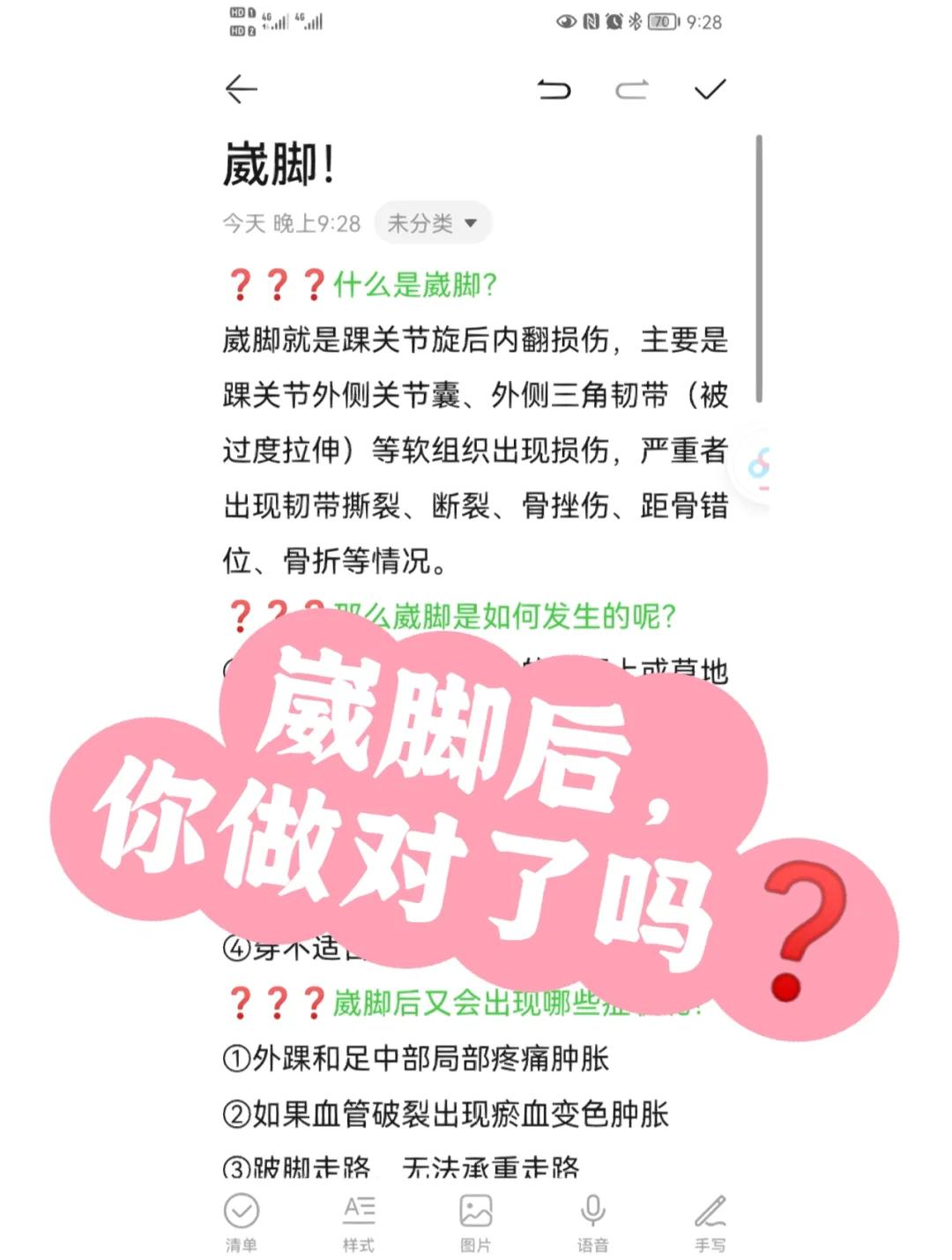 9、治疗措施直接影响恢复进程早期处理需立即停止活动并冷敷每次1520分钟,每日34次,以减轻肿胀和疼痛若处理不当可能加重损伤,延长恢复时间固定与康复治疗方面,严重扭伤需用石膏或支具固定26周根据损伤程度调整,期间需进行踝关节屈伸旋转等小幅度康复锻炼,防止肌肉萎缩和关节僵硬规范。