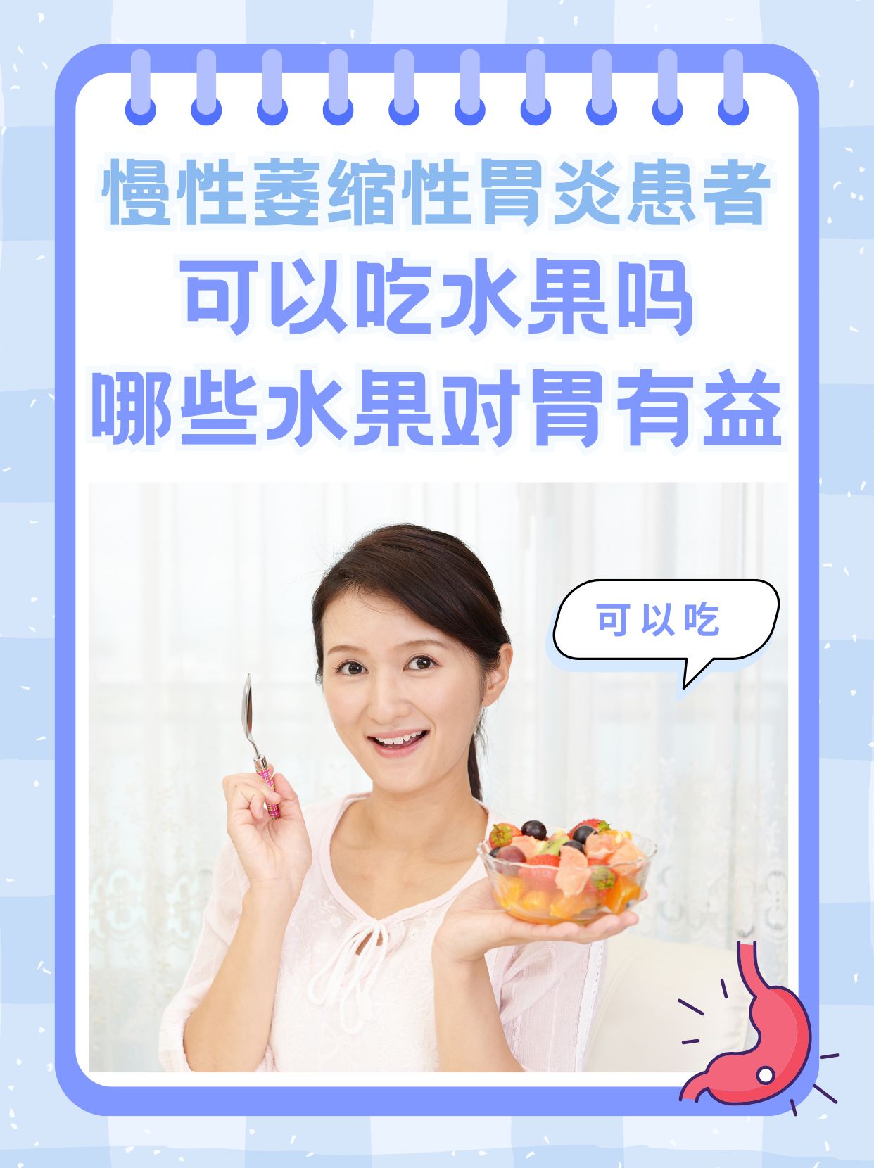 食用时间最好在两餐饭之间吃水果,避免饭后立即食用食用量不要一次性吃太多,以免加重胃肠负担食品安全确保水果新鲜无农药残留,避免食用变质的水果特殊情况下的饮食建议如果糜烂性胃炎患者胃黏膜糜烂的范围比较大甚至伴有出血,建议暂停吃水果,以软食流食为主,如各类粥待病情治愈后,可以恢复吃水果,但在疾病恢复初期,对于酸味比较重的水果,建议少吃或。