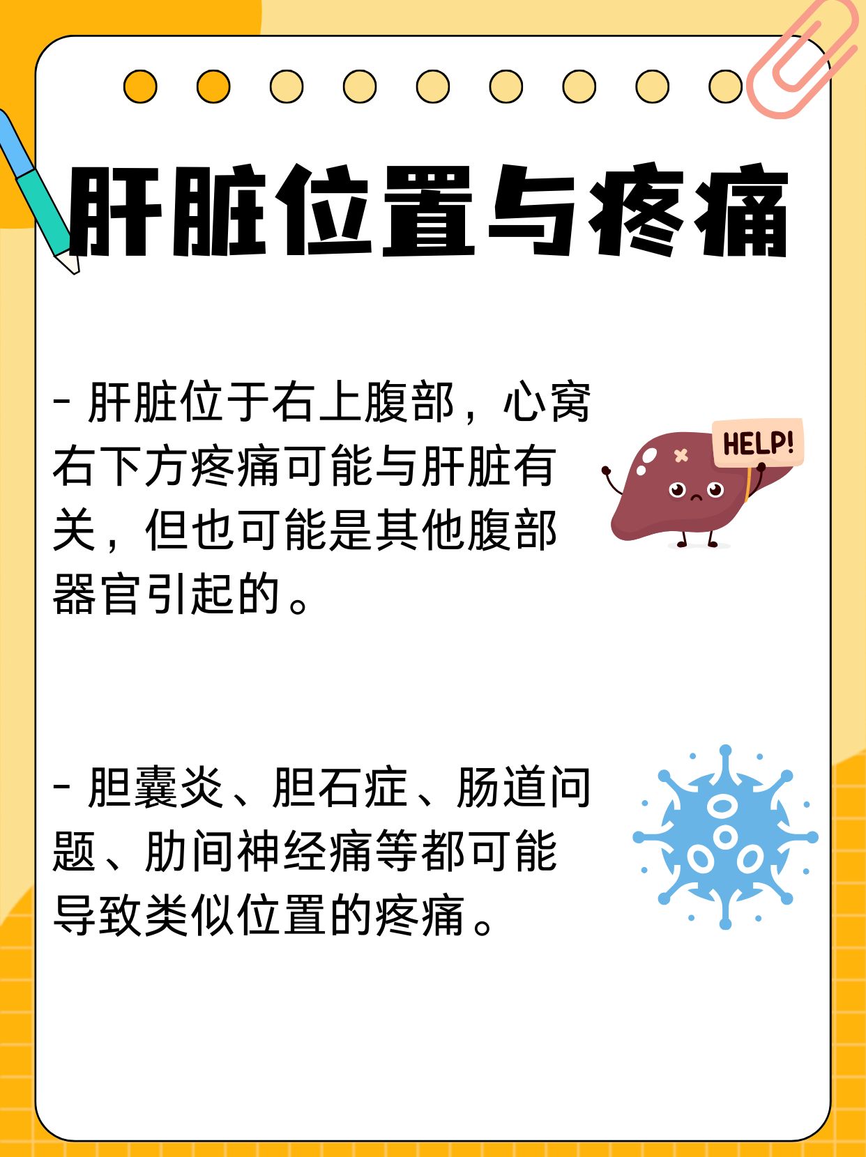 肝区疼痛不一定是肝癌肝区疼痛的原因众多,不能仅凭这一症状就判定为肝癌,需通过科学检查手段明确病因具体原因如下一良性肝病相关因素1肝炎各类肝炎如病毒性肝炎药物性肝炎自身免疫性肝炎均可导致肝细胞肿胀,牵拉肝包膜引发疼痛例如,慢性乙肝患者常出现肝区隐痛,全球约24亿人;许多非肝癌因素也可导致肝部疼痛,如肝脏良性疾病肝炎肝脓肿肝囊肿等,这些疾病会导致肝脏细胞受损肿大或囊肿破裂,刺激肝脏包膜引发疼痛胆囊疾病胆囊炎胆结石因与肝脏位置相邻,疼痛可能放射至肝区胸壁疾病右侧胸膜炎肋软骨炎的疼痛也易与肝区疼痛混淆此外,过度劳累长期大量;肝区疼痛不一定是肝癌肝区疼痛与肝癌存在关联,但并非唯一病因肝癌引发肝区疼痛的机制主要是肿瘤生长刺激肝包膜等结构,约半数以上肝癌患者会出现间歇性或持续性隐痛胀痛但肝炎如病毒性肝炎药物性肝炎导致肝细胞炎症水肿,也会引发肝区不适肝脓肿因病原体感染形成脓肿,炎症刺激周围组织可;肝部轻微疼不一定是肝癌可能由其他常见疾病引起肝炎是常见原因之一,包括病毒性肝炎如甲肝乙肝丙肝和自身免疫性肝炎以乙肝为例,病毒持续感染会导致肝脏炎症反应,引发肝区轻微疼痛,研究显示部分乙肝患者会出现此类症状肝脓肿由细菌等病原体感染肝脏形成脓肿,炎症刺激肝包膜导致疼痛,糖尿病;肝区隐痛可能是肝癌的早期症状之一,但不能仅凭此症状判定为肝癌早期,需结合其他表现及检查综合判断肝区隐痛与肝癌早期症状的关系肝区隐痛可能是肝癌早期的表现,多为间歇性或持续性钝痛胀痛,由肿瘤生长刺激肝包膜或周围组织引起但此症状并非肝癌特有,其他疾病如肝炎乙型病毒性肝炎等因炎症刺激肝。
