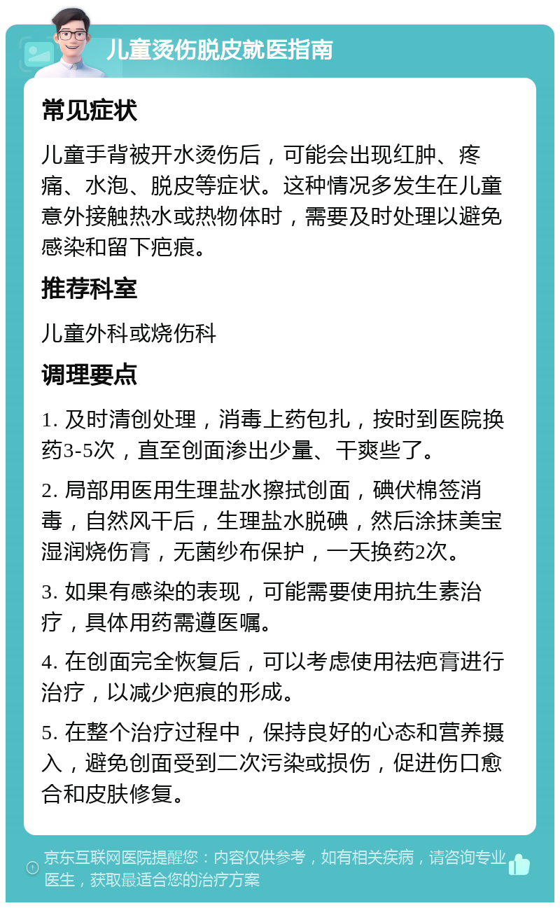被开水烫伤起泡后,可按照以下步骤处理第一步紧急降温立即用流动的自来水冲洗烫伤部位,持续1020分钟流动水可快速带走热量,降低皮肤深层损伤风险,同时缓解疼痛需注意水温不宜过低避免冻伤,水流强度以温和为宜第二步消毒处理待烫伤部位冷却后,用无菌棉签蘸取碘伏轻柔擦拭创面碘伏能有效。