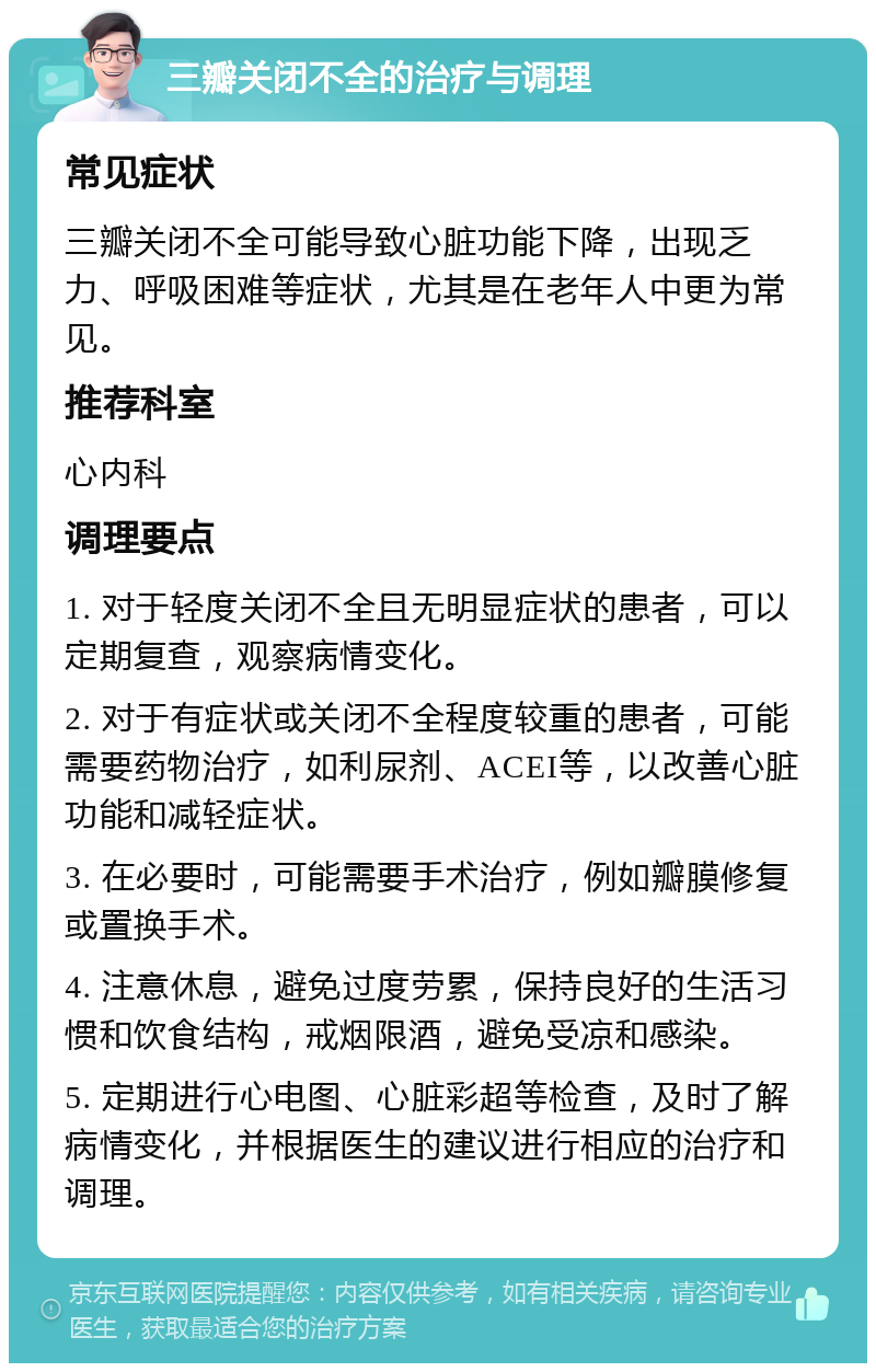 5、临床表现及影响轻度三尖瓣关闭不全常无显著症状,部分患者可能仅感乏力或易疲劳,但易被忽视由于反流血液量较少,心脏可通过代偿机制维持正常功能,短期内对心输出量影响较小,通常不会引发严重心功能不全然而,需定期监测病情,以防关闭不全逐渐加重诊断主要依赖超声心动图该检查可清晰观察三尖;这些表现提示三尖瓣关闭不全的程度较轻,对心脏功能和血液循环的影响较小,通常不属于严重疾病对于此类患者,可通过散步太极拳瑜伽等温和运动促进血液循环,增强心肺功能,同时需定期复查如心电图X线心脏超声等,以监测病情变化总结三尖瓣关闭不全的严重性需结合症状体征及检查结果。