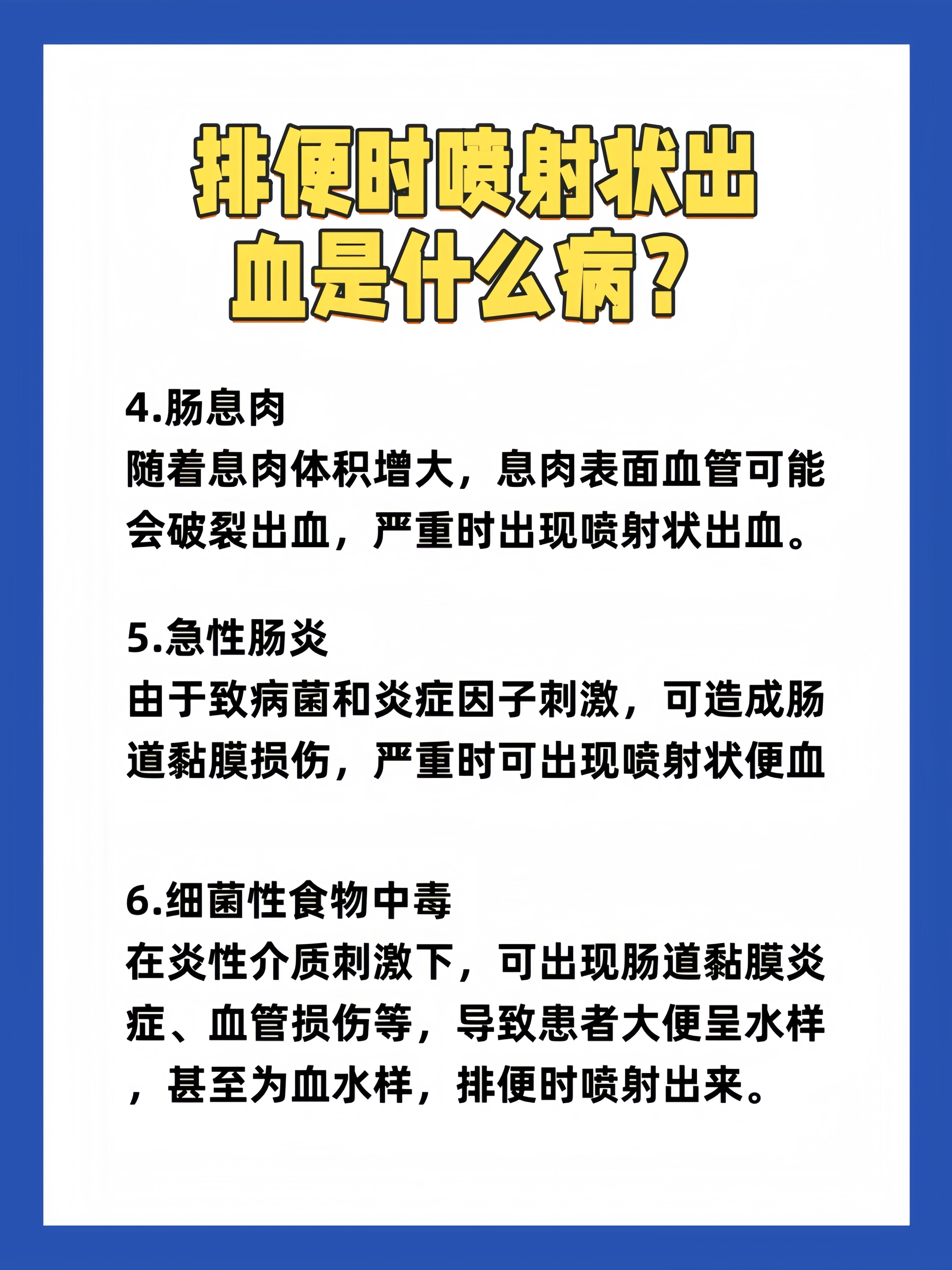 拉屎拉血可能由多种原因引起,需结合具体症状和人群特征综合判断1 常见良性病因 痔疮或肛裂是最常见的直接原因痔疮是肛门静脉曲张形成的团块,肛裂为肛门黏膜或皮肤裂伤干结粪便摩擦病变部位会导致出血,血液通常呈鲜红色,附着于粪便表面或厕纸肠道息肉直肠或结肠息肉表面黏膜脆弱,易因摩擦或;便秘拉血常见于痔疮肛裂肠道息肉结直肠肿瘤等疾病,不同病因的成因年龄性别影响及处理方式存在差异一常见病因与特征痔疮因肛管或直肠下端静脉丛充血肿大,便秘时干结粪便摩擦黏膜或血管导致破裂出血,内痔多无痛性鲜红便血,外痔伴肛门肿物或疼痛,长期久坐妊娠等因素易诱发肛裂为肛管皮肤全层。