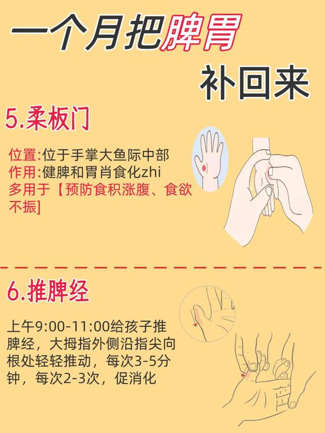 • 推脾经:上午9-11点(脾经当令时),从娃大拇指指尖向指根轻轻推,每次3-5分钟、做2-3次,促消化超有效。