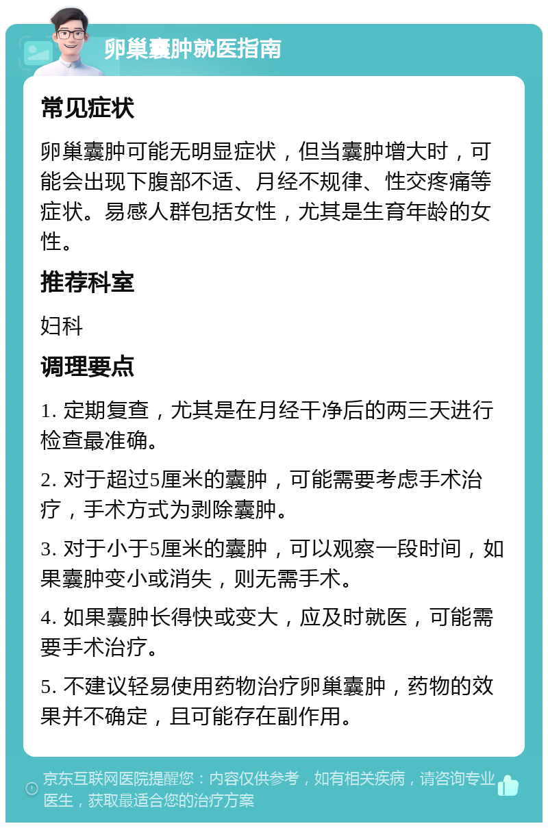 卵巢囊肿形成的原因主要有以下方面遗传因素部分患者存在家族遗传倾向,家族中有卵巢囊肿患者的人群患病风险较高某些基因突变可能导致卵巢细胞异常增殖和分化,增加患病可能有家族病史者建议定期进行妇科检查,以便早期发现和干预内分泌因素1雌激素水平异常女性体内雌激素水平过高是重要因素雌激素。