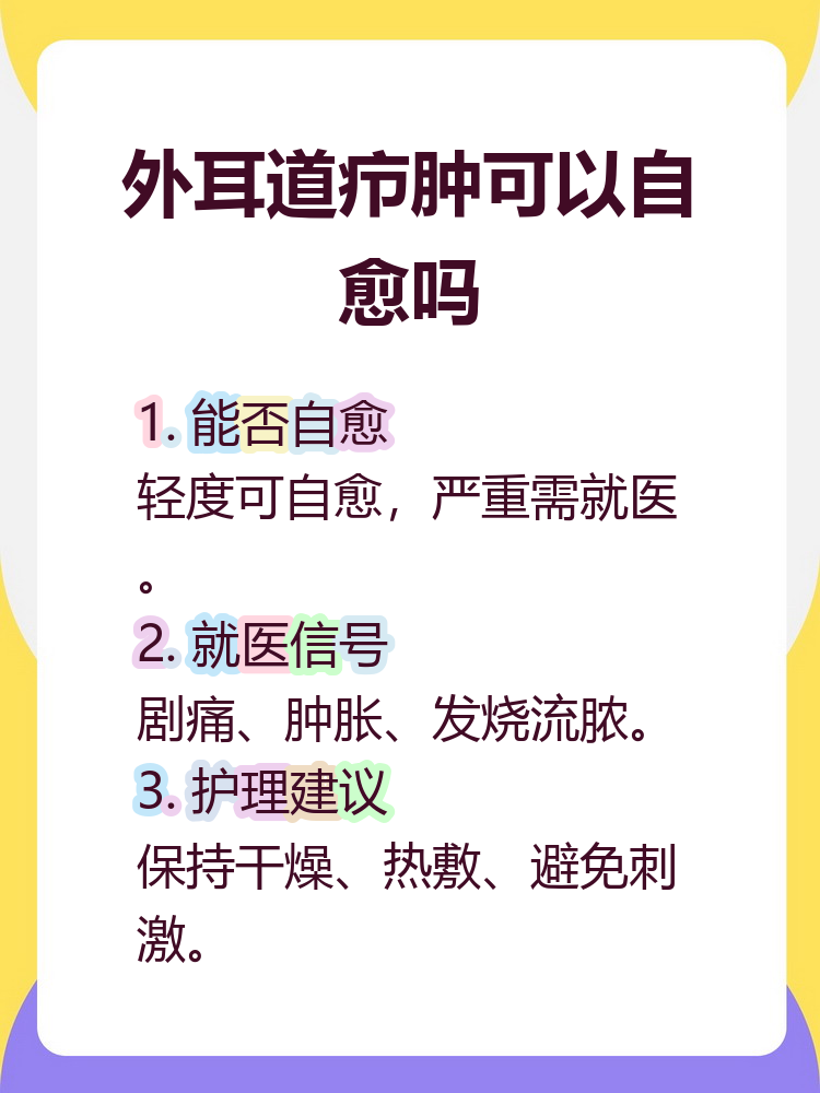 1、耳朵里面肿且一碰就疼,需根据病因采取针对性措施,核心原则是及时就医规范治疗,避免自行处理加重病情具体处理方式如下第一步立即就医明确病因耳朵内部肿痛可能由外耳道炎症如急性外耳道炎外耳道疖肿毛囊感染形成的脓肿或中耳炎等疾病引发这些疾病的症状相似,但治疗方法不同例如;针对性抗炎治疗方案局部用药使用抗生素软膏如莫匹罗星软膏涂抹患处,每日23次,可抑制细菌繁殖并减轻炎症若疼痛剧烈,可短期使用含利多卡因的凝胶缓解疼痛热敷促进成熟每日用温热毛巾敷耳部1015分钟,每日3次,可加速疖肿血液循环,促进脓液形成与排出需注意温度避免烫伤皮肤口服抗生素;耳朵里面肿了一碰就疼,需根据具体病因规范处理,常见原因及应对方法如下外耳道炎外耳道皮肤及皮下组织肿胀疼痛,可能伴有耳道分泌物增多治疗以控制感染为主,可在医生指导下使用抗生素滴耳液,如氧氟沙星滴耳液盐酸洛美沙星滴耳液等,直接作用于患处以抑制细菌繁殖若疼痛严重,可口服非甾体类;耳朵里长包一按就疼需根据病因针对性处理,常见病因及治疗方式如下外耳道疖肿由病原体感染或皮肤损伤引发外耳道软骨部毛囊及周围组织炎症典型症状为耳痛局部红肿包块,按压时疼痛加剧治疗以药物为主,早期可局部涂抹鱼石脂甘油或鱼石脂膏促进脓液排出,同时口服双氯西林等抗生素控制感染若已化脓。