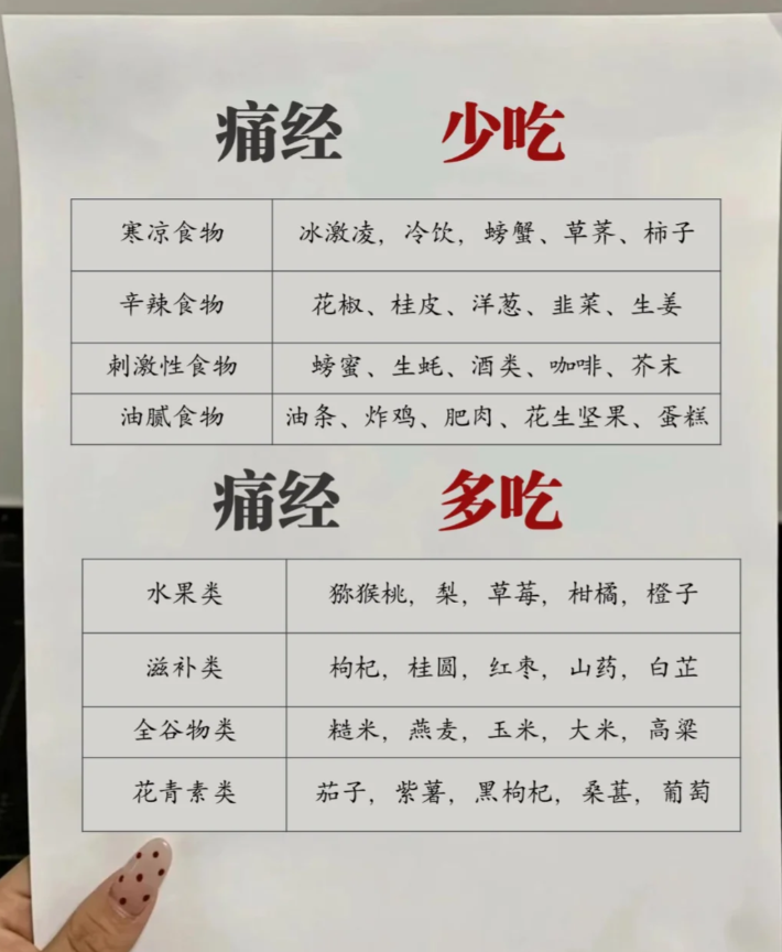 12、月经期间需避免以下几类食物一寒凉性食物包括生冷瓜果如西瓜甜瓜梨和冷饮如冰镇饮料冰淇淋此类食物会刺激盆腔血管收缩,导致经血流通不畅,可能引发痛经或加重子宫寒冷状态研究表明,长期经期大量食用生冷瓜果的女性,痛经发生率显著升高冷饮还会影响胃肠道功能,加剧盆腔血管收缩,对。