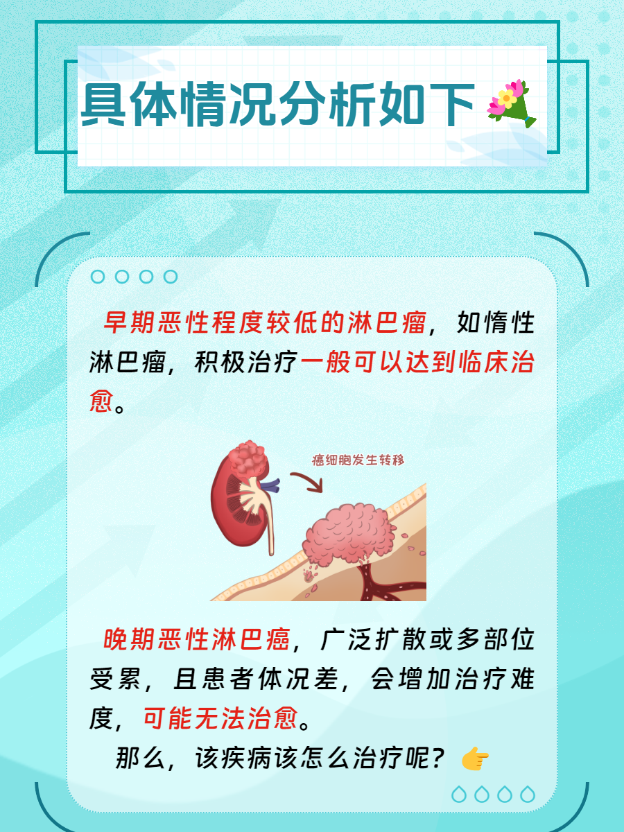 早期淋巴癌五年生存率早期淋巴癌通过手术治疗后,五年生存率可以达到80%90%这意味着大部分早期淋巴癌患者在接受适当治疗后,可以长期存活治愈可能性实际上,早期淋巴癌通过手术是有可能治愈的中晚期淋巴癌五年生存率中晚期淋巴瘤的五年生存率一般在20%30%,相对较低治疗方式中晚期淋巴。