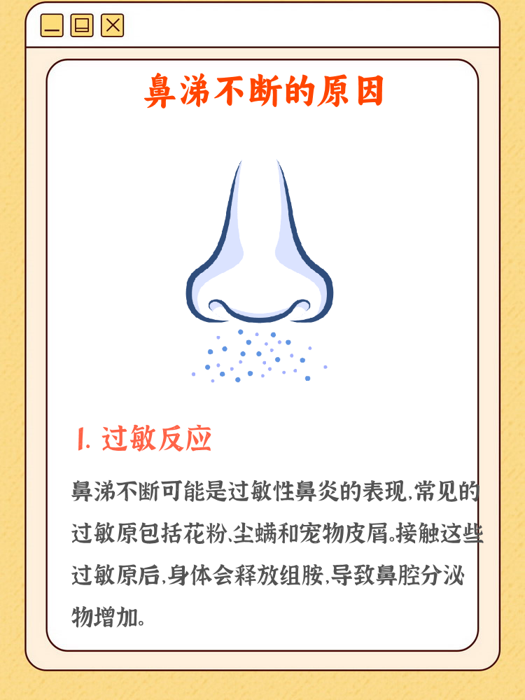 打喷嚏频率感冒时打喷嚏不突出,多为偶尔几个过敏性鼻炎则频繁出现连续多个喷嚏,是典型症状之一咳嗽情况感冒常伴刺激性干咳或少量白痰,因咽喉部及气管受累鼻炎一般不单独引起咳嗽,除非鼻涕倒流刺激咽喉晨起时明显二病程差异 感冒病程较短,通常12周可自愈,儿童因免疫力较弱可能。