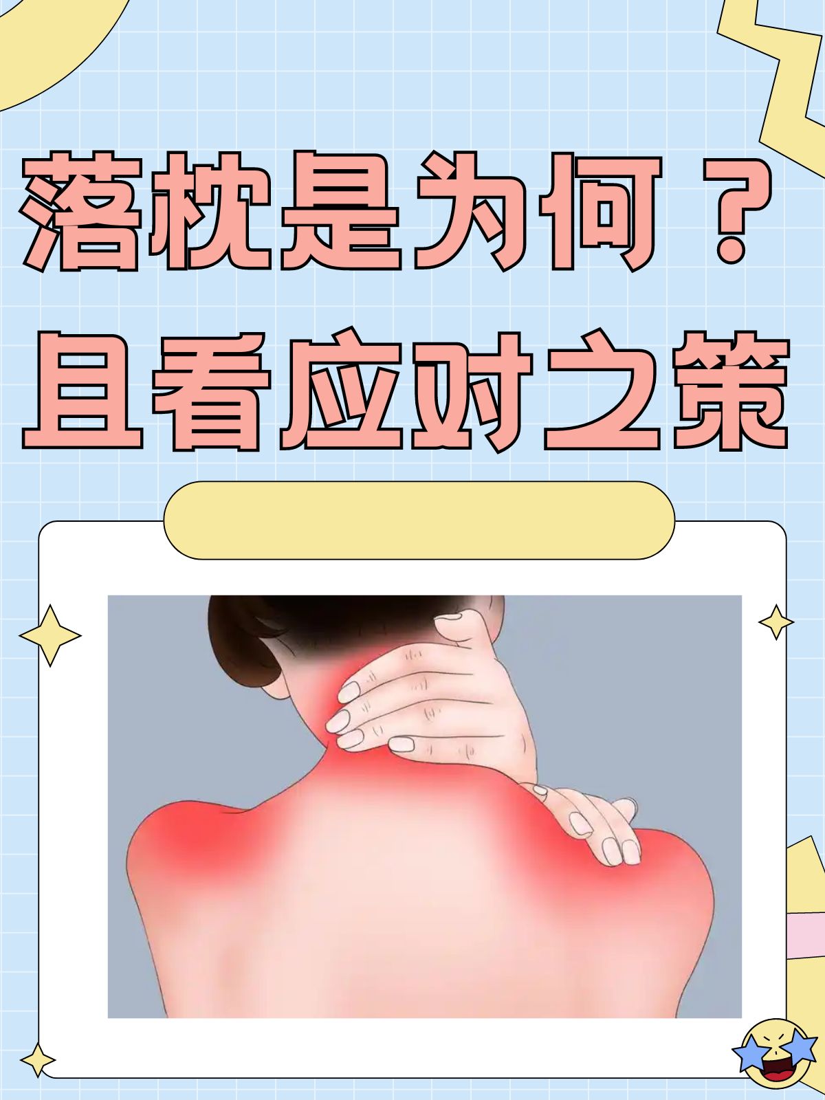 3、一一般治疗1休息落枕后24小时内需减少颈部活动,避免剧烈运动或长时间保持固定姿势,以减轻肌肉和韧带负担2冷敷用冰袋或冷毛巾敷于疼痛部位,每次1520分钟,每日数次冷敷可收缩血管,缓解急性期疼痛和肿胀3热敷24小时后改用热毛巾或热水袋热敷,同样每次1520分钟,每日数次热敷。