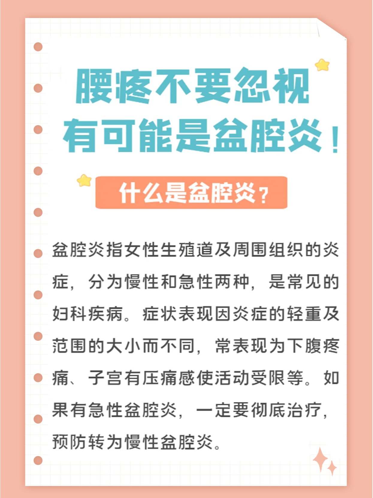 盆腔炎是一种常见的妇科疾病,患者常会表现出下腹疼痛白带增多月经不调等症状淮北妇科医院的专家指出,盆腔炎不仅会导致腰痛,如果女性经常感到腰疼,这可能提示她患上了盆腔炎因此,女性应该提高警惕,注意预防盆腔炎引起腰痛的原因多种多样,对于女性来说,多种妇科疾病都有可能引发腰痛,其中最。