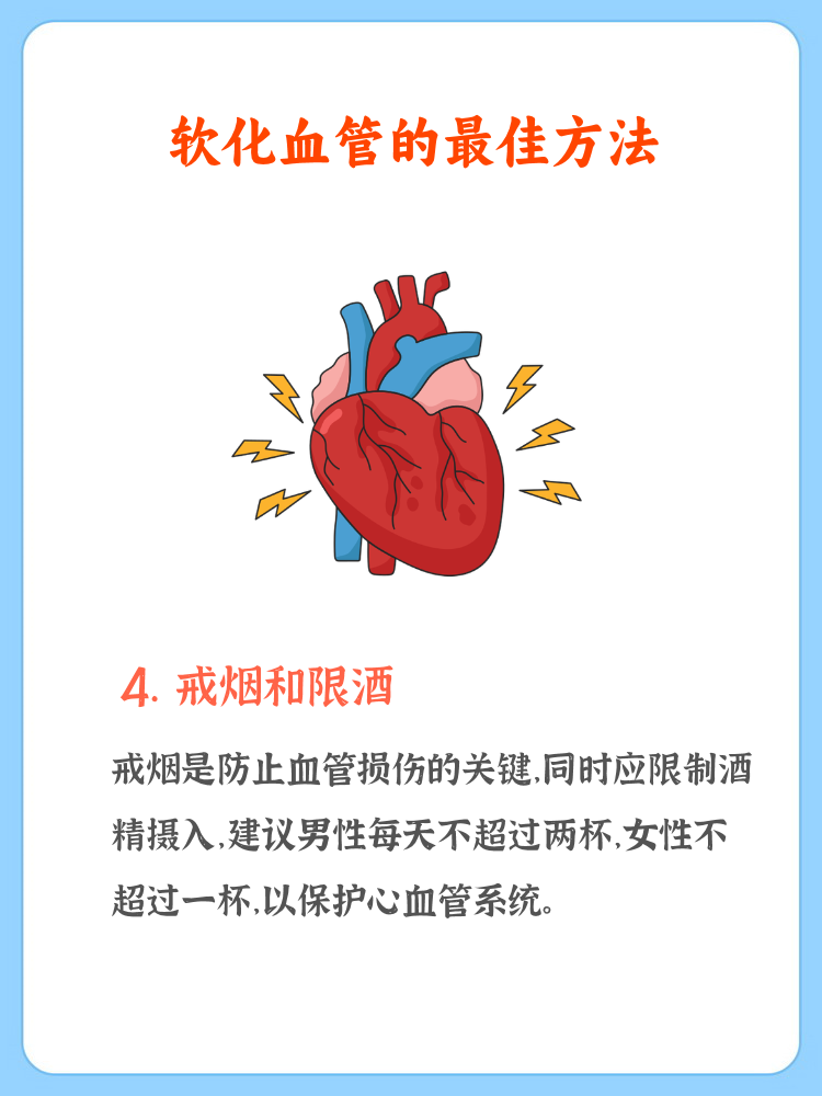软化血管的最好方法主要包括健康饮食规律运动和适当补充营养品1 健康饮食 饮食清淡以低热量低盐饮食为主,保证足够的蛋白质维生素纤维素和微量元素多食水果蔬菜来润肠通便,避免摄入过多脂肪卵磷脂摄入卵磷脂是血管的“清道夫”,具有乳化分解油脂的作用,能降低血液粘稠度,保障血液。
