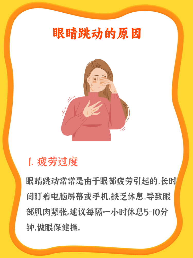 两个眼睛的眼皮老跳,通常是由于眼部肌肉不自主抽搐引起的,具体原因及应对方式如下一常见诱因眼皮跳的核心机制是眼轮匝肌的不自主收缩,可能由以下因素触发生理性因素长期用眼过度如长时间看电子屏幕睡眠不足精神紧张或压力过大,导致眼部肌肉疲劳环境刺激强光风沙刺激或摄入过量咖啡因酒精等兴奋性物质;可能是神经炎症引起的患者可以考虑喝一些消炎药进行调理,并建议前往医院进行检查,以排除大脑局部刺激性问题的可能性必要时,医生可能会建议使用针灸治疗同时,平时可以喝一些营养物质以辅助缓解总之,眼睛跳并不直接预示什么特定的事件或结果,而是可能与身体状况有关如果出现持续或频繁的跳动,建议;眼睛跳没有特殊的预兆,它可能预示眼部组织存在问题或眼睛疲劳以下是具体的解释眼部疲劳长时间看书学习电脑办公或游戏时,眼睛可能会因为过度使用而感到疲劳,这时眼睛跳就是一种提示,表明眼睛需要休息眼部疾病眼睛跳有时可能是某些眼部疾病的表现,如睑缘炎等眼部常见疾病,或者其他疾病导致的。