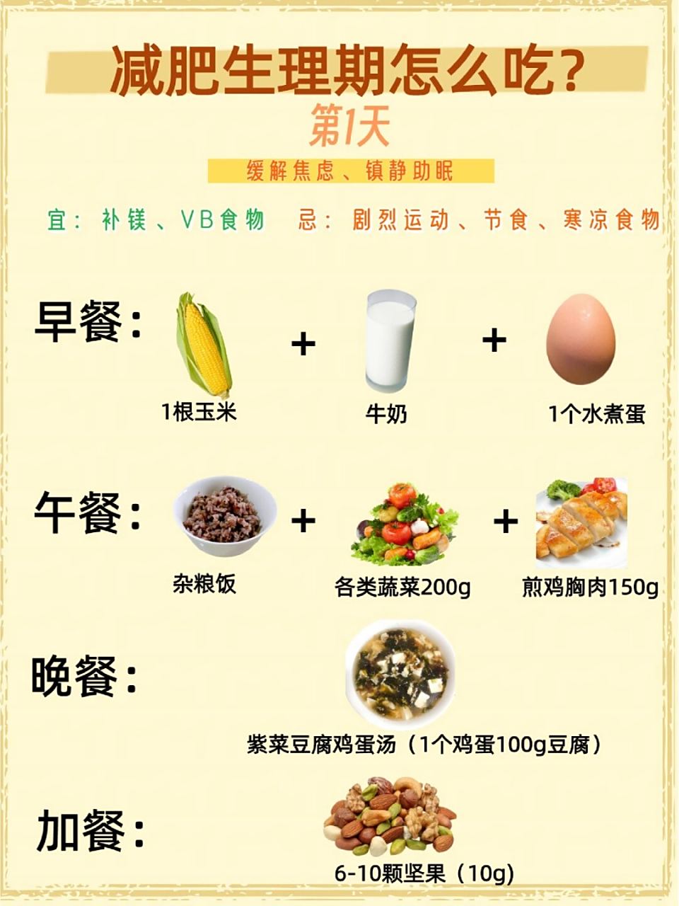 8、月经期间减肥最快的方法需要注意不同阶段的调整1 月经期17天 饮食调整此阶段体重通常较重,建议减少主食摄入,特别是谷类米饭面包等,同时减少糖分摄取,避免能量囤积 运动增加多做运动,有助于消耗多余能量 餐食安排早餐与晚餐可摄取除主食外的食物,如水果蔬菜,不必减量2 月经期后一周内 饮。