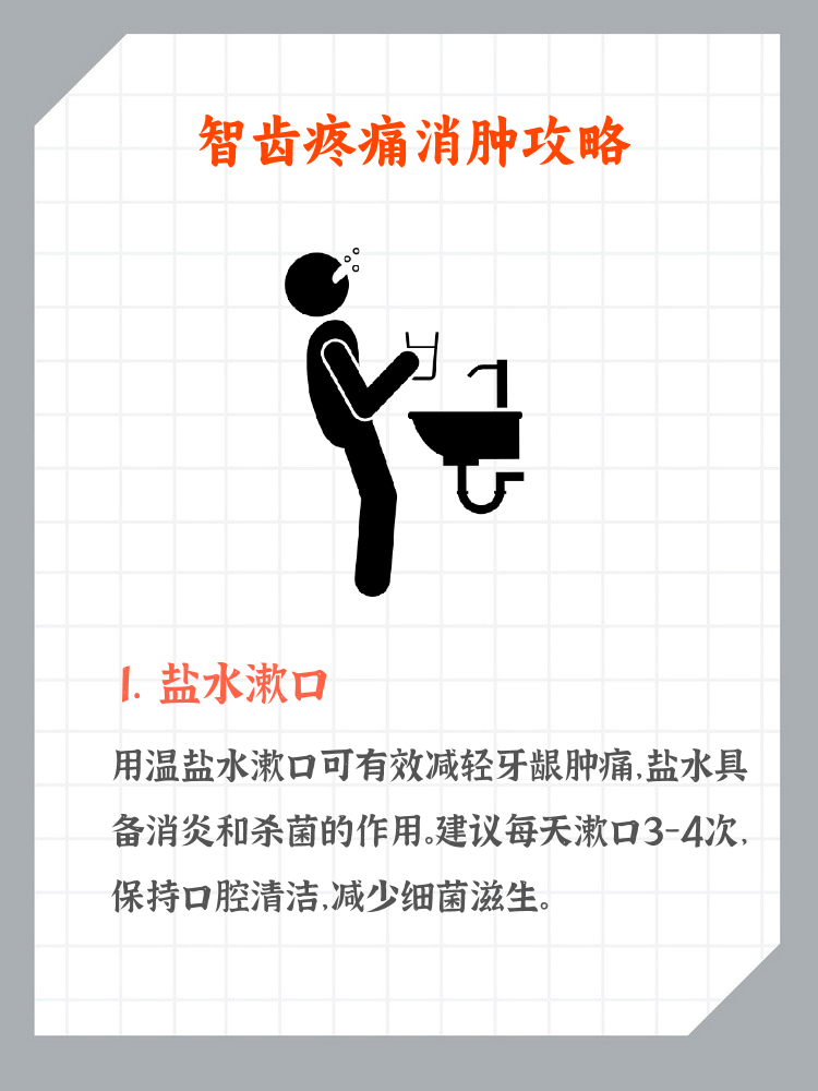 孕妇牙龈肿痛可通过以下方法立刻缓解疼痛,但需优先咨询医生以确保安全1 盐水漱口用温盐水漱口可减轻炎症将半茶匙盐溶解于一杯温水中,搅拌均匀后含漱15秒,重复34次盐水能抑制细菌繁殖,缓解肿胀,但需注意水温不宜过高,避免刺激牙龈2 使用药物牙膏选择含丁硼或康复新液成分的药物牙膏,刷牙。