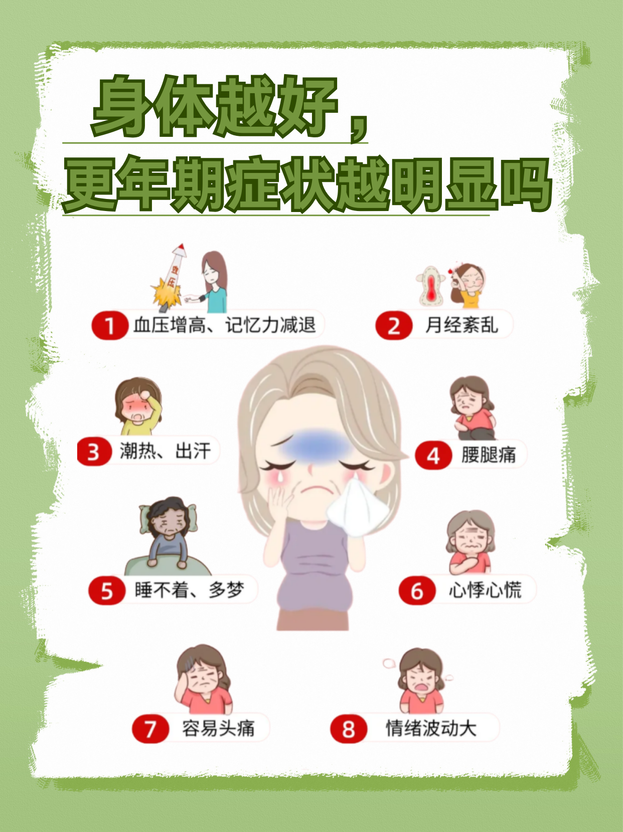 更年期是女性卵巢功能从旺盛状态逐渐衰退到完全消失的一个过渡时期,包括绝经和绝经前后的一段时间时间范围更年期通常出现在女性45~55岁,是卵巢功能开始减退到绝经后1年之间的时间段,大约持续3~5年症状表现更年期症状包括心情焦虑抑郁失眠爱出汗易疲劳心悸潮热肌肉关节疼痛耳鸣;1 更年期是女性从中年步入老年的过渡时期,此时体内雌激素水平迅速下降,导致一系列雌激素缺乏的症状2 更年期的症状常被周围人误解,因此有时被看作是“烦人的”特征实际上,更年期是人类的一个正常生理阶段,并不可怕3 更年期的年龄范围一般在45至55岁之间,但具体表现因人而异有些女性由于;女性更年期指从月经出现不规律到真正绝经的时间,平均年龄在中国城市女性是495岁,中国所有女性统计起来是485岁如果44岁后出现更年期症状也在正常范围,40岁前绝经称为卵巢早衰,通过激素检查可以明确诊断,常见症状如下1月经改变进入更年期后,多数患者都会出现月经异常,可能会出现周期延长月经。