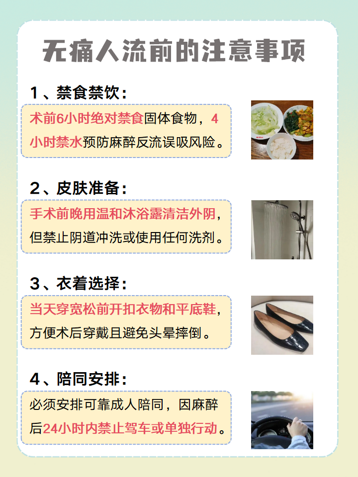 做无痛人流后要注意以下事项禁止性生活与盆浴禁止性生活一个月,禁盆浴一个月人流术后同房或盆浴可能导致宫内感染子宫内膜炎或盆腔炎同时,注意外阴干燥,多喝温水适当活动术后两天可适当下床活动,不可长期卧床长期卧床可能导致子宫内的淤血排出困难,进而引发慢性子宫内膜炎口服药物术后可口服抗生素预防感染,并口服益;无痛人流术前术后需要注意以下事项术前注意事项 术前检查需要进行全面的术前检查,包括白带检查B超检查心电图检查等,确保身体状况适合进行手术 避免同房术前应避免同房,以减少手术风险和感染的可能性 禁食由于手术需要全身麻醉,术前需禁食,以免在手术过程中出现呕吐误吸等危险情况;做无痛人流后要注意以下几点注意休息手术后2小时内不要开车或进行高空作业,避免过度劳累,确保身体得到充分休息禁止性生活与避孕禁止性生活一个月,以防止感染和其他并发症同时,建议无痛人流后6个月再考虑备孕,期间注意采取避孕措施加强营养多进食高营养食物,以促进身体恢复避免食用生冷。