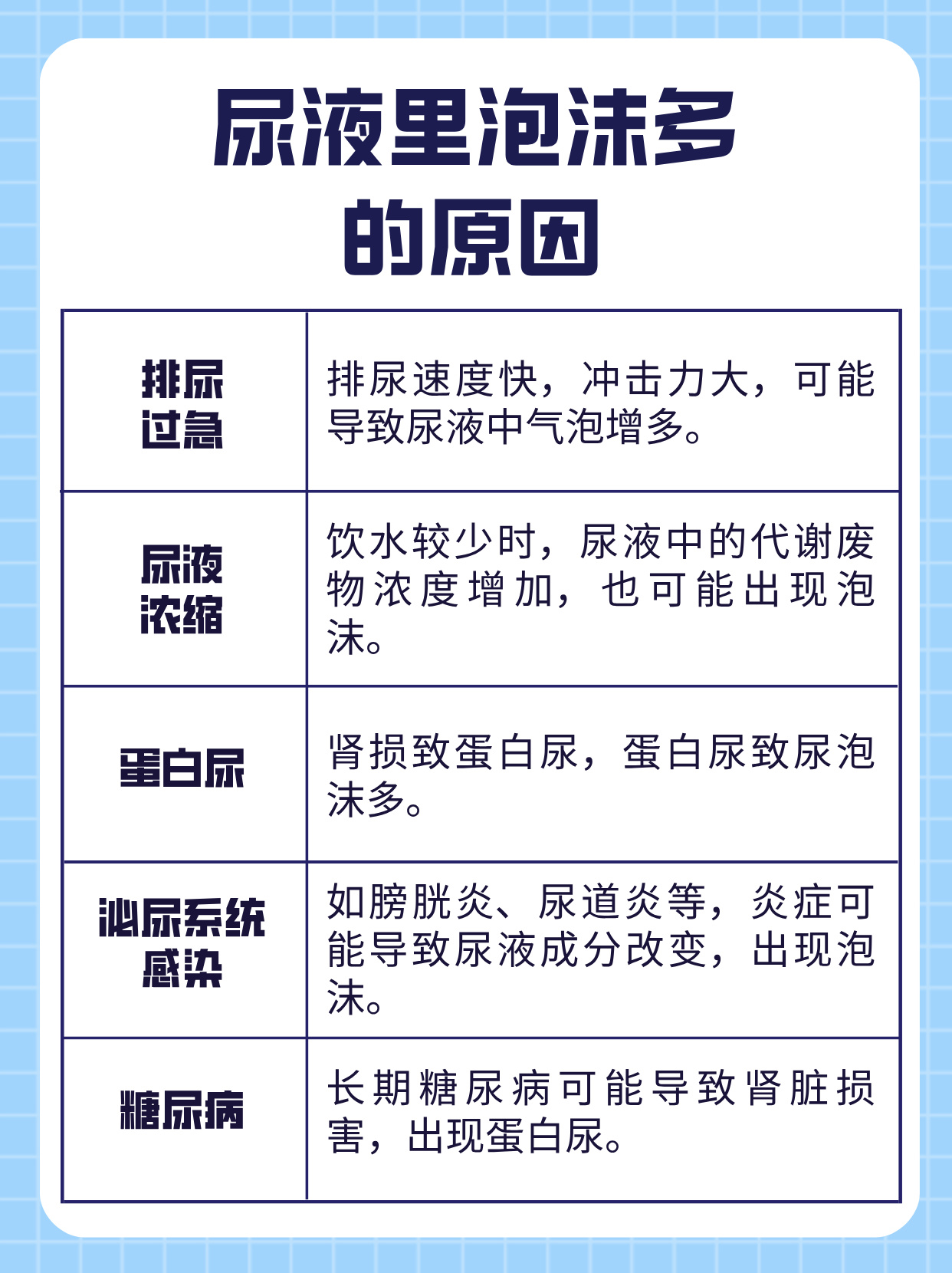 男孩子小便有泡沫的原因可能有以下几种尿液浓缩原因不爱饮水或长时间憋尿,导致尿液中的溶质浓度增加表现主要表现为晨起后第一次小便或前几次小便有泡沫,其他时间的排尿泡沫较少或没有泡沫,同时尿液颜色发黄建议进行尿常规检查,如果尿液比重升高,多提示存在尿液浓缩,通常不存在其他问题;蓝绿色尿多与用药有关,但也可能与某些疾病相关棕色尿可能是急性肾炎肾挤压烧伤溶血性贫血等疾病的信号,也可能是服用大黄剧烈运动后的正常生理现象总结尿液的异样往往能反映出身体的健康状况当尿液出现发黄气味重以及泡沫尿红色尿乳糜尿等异常时,应及时关注并去医院进行相关。