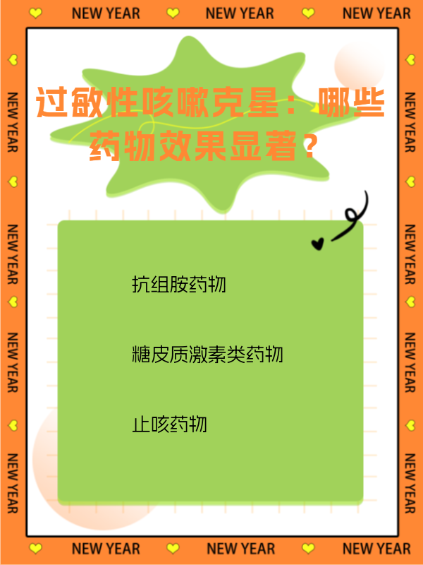 7、1 抗过敏药物 酮替芬可以有效减少过敏反应,从而缓解咳嗽症状2 白三烯受体阻滞剂 顺尔宁此类药物能降低气道的高反应性,是治疗过敏性咳嗽的重要药物使用时需注意疗程应足够,反复过敏性咳嗽的情况下,疗程应尽量在3个月以上3 激素类药物 在症状非常严重,如出现气喘气急等情况时,可能需要口服或静脉应用激素类药物。